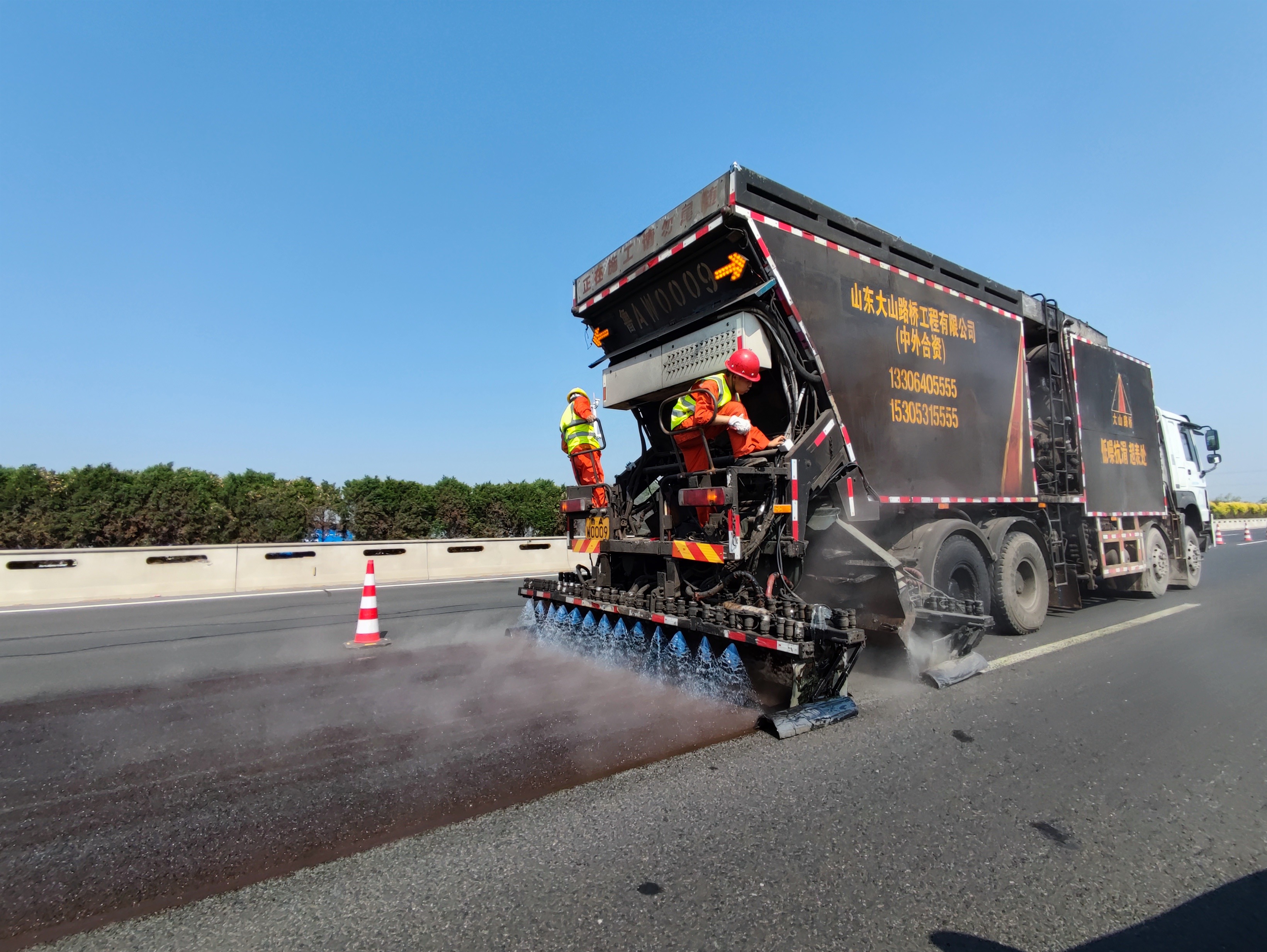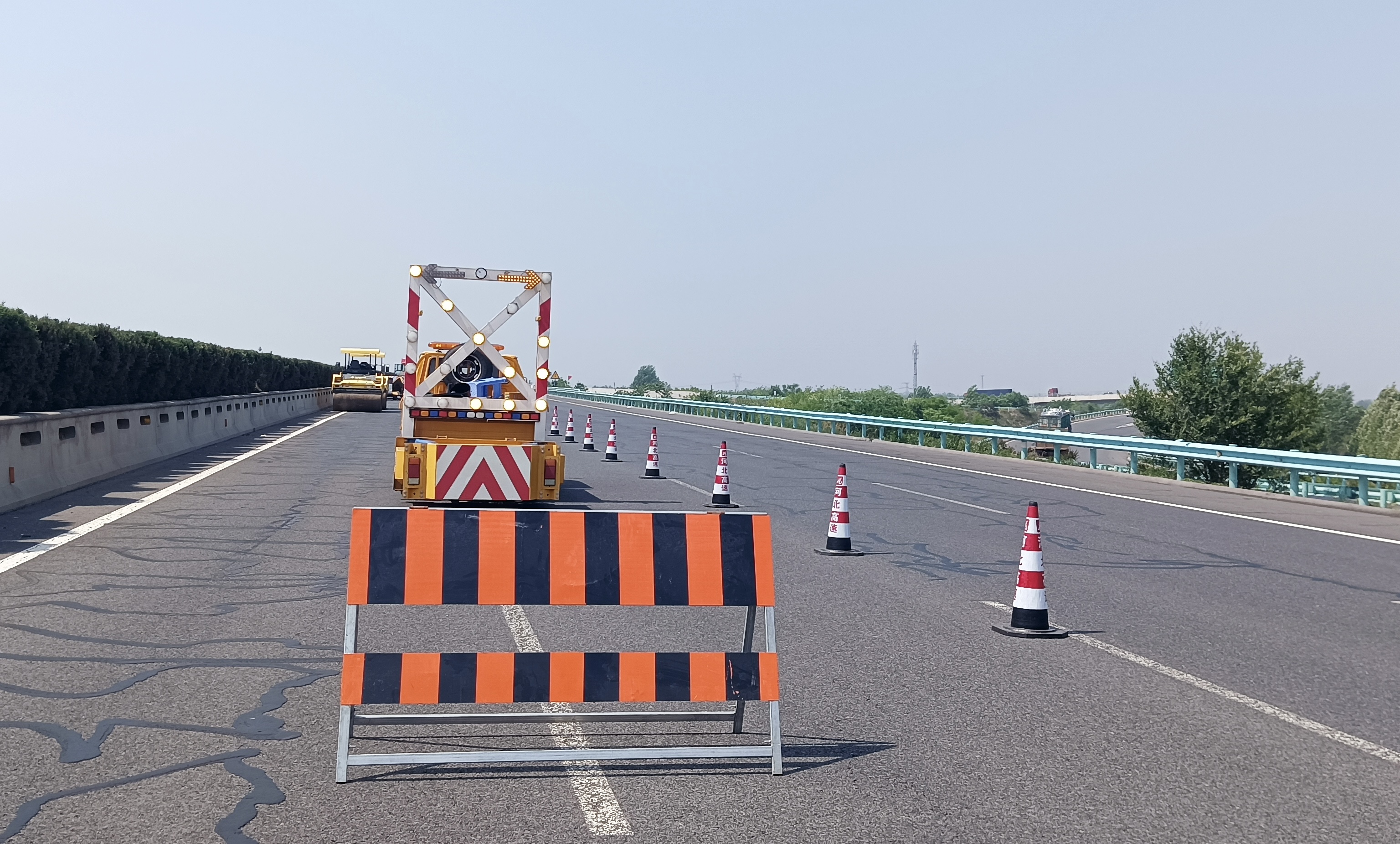 為確保工程有序?qū)嵤?,石安分公司立足?shí)際、科學(xué)謀劃、務(wù)求實(shí)效,采取多項(xiàng)措施加快推進(jìn)。一是抓組織領(lǐng)導(dǎo),一盤棋統(tǒng)籌推進(jìn)。印發(fā)主線養(yǎng)護(hù)工程施工全過程安全質(zhì)量控制方案,成立以黨委書記為組長的領(lǐng)導(dǎo)小組,下設(shè)9個(gè)工作組,構(gòu)建目標(biāo)清晰、內(nèi)容具體、職責(zé)明確、邊界清晰的工作機(jī)制。二是抓工作進(jìn)度,一股繩凝心聚力。倒排進(jìn)度、掛圖作戰(zhàn),采取日協(xié)調(diào)、周調(diào)度、月控制的工作舉措,加大設(shè)備催發(fā)催運(yùn)力度,抓好安全環(huán)保管理,做好隱患排查治理,確保項(xiàng)目“日有變化、周有進(jìn)度、月有突破”,高質(zhì)量、高效率按期完成項(xiàng)目節(jié)點(diǎn)任務(wù)。三是抓技術(shù)創(chuàng)新,一把尺降本增效。在集團(tuán)公司的帶領(lǐng)下,前往山東高速取經(jīng),創(chuàng)新引用“抗滑低噪超表處”施工技術(shù),攻克常規(guī)道路養(yǎng)護(hù)帶來的弊端,并創(chuàng)新性設(shè)計(jì)利用廢舊輪胎裝置“輪胎防撞墻”,實(shí)現(xiàn)降本增效。四是抓現(xiàn)場管理,一張網(wǎng)安全覆蓋。搭建“作業(yè)控制區(qū)安全通道”,增加智慧錐桶、高音喇叭、警報(bào)器、紅黃旗幟,構(gòu)建封閉性好、安全性高的作業(yè)控制區(qū)。五是抓全過程管理,一條心提升質(zhì)量。從原料廠家的實(shí)地考察、各類原材料、機(jī)械設(shè)備、生產(chǎn)/目標(biāo)配合比的見證取樣試驗(yàn)到施工現(xiàn)場首件工程制嚴(yán)格實(shí)施、施工工序的平行監(jiān)督再到最終試驗(yàn)數(shù)據(jù)的獲取;從合同文件、招標(biāo)文件、施工圖的全面學(xué)習(xí)研究到與設(shè)計(jì)院就技術(shù)參數(shù)、數(shù)據(jù)的核實(shí)再到施工工藝細(xì)節(jié)的反復(fù)磋商、調(diào)整,實(shí)現(xiàn)了施工過程的全過程管理,確保施工質(zhì)量達(dá)標(biāo)。