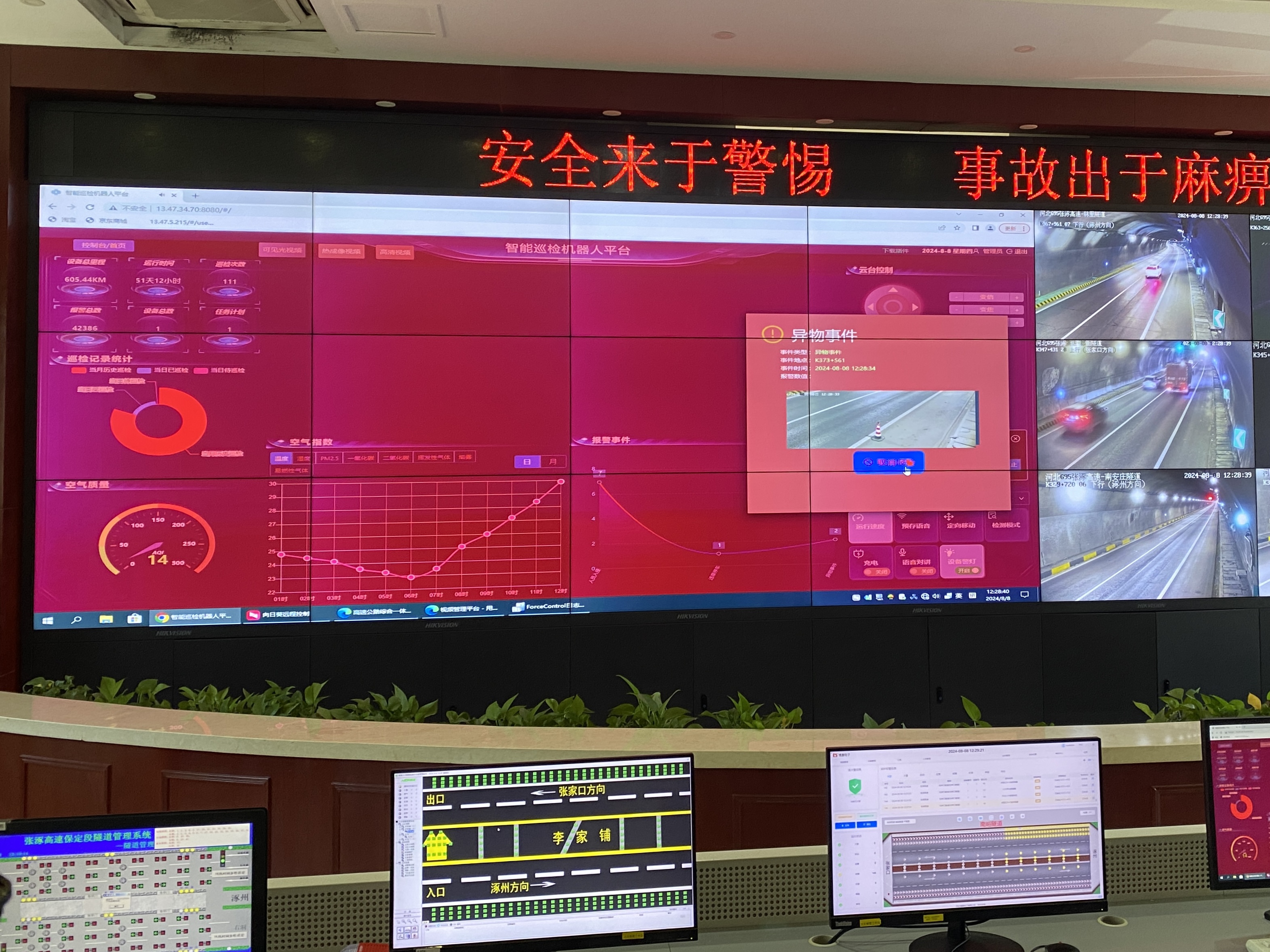 “12:38,北龍門隧道K373+561發(fā)生異物事件”,張涿分公司李家鋪隧道管理所監(jiān)控中心監(jiān)控大屏現(xiàn)場亮出“紅燈”,彈出異常事件窗口,工作人員第一時間做出緊急處理,實(shí)時觀察現(xiàn)場異物情況,并通過平臺控制機(jī)器人搭載喇叭喊話來警示過往車輛?!八淼姥矙z機(jī)器人系統(tǒng)實(shí)現(xiàn)由人工巡查向智能管控轉(zhuǎn)變,為實(shí)時預(yù)警監(jiān)測、高效應(yīng)急處置提供了重要科技保障”,隧道管理所負(fù)責(zé)人指出。