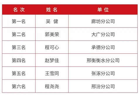收費(fèi)崗位技能比武總決賽以知識(shí)競(jìng)賽形式舉行,分為必答題、搶答題和風(fēng)險(xiǎn)題三類,內(nèi)容涵蓋收費(fèi)全流程業(yè)務(wù)知識(shí),旨在考查選手的業(yè)務(wù)理論基礎(chǔ)、政策掌握水平以及臨場(chǎng)應(yīng)變能力,通過比武不斷提高職工技術(shù)水平和技能層次,培養(yǎng)更多“一專多能”的復(fù)合型和創(chuàng)新型人才。經(jīng)過比拼,最終廊坊分公司吳健憑借最后一道30分風(fēng)險(xiǎn)題的完美作答,逆風(fēng)翻盤獲得第一名,大廣分公司郭美榮等選手分獲二至六名。比賽還設(shè)置了優(yōu)秀獎(jiǎng)。