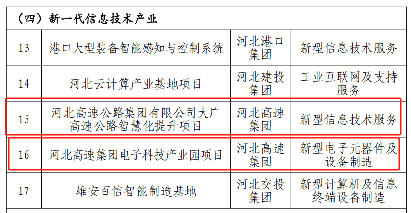 近日,河北省國資委公布了《河北省國資委監(jiān)管企業(yè)戰(zhàn)略性新興產(chǎn)業(yè)示范企業(yè)和示范項(xiàng)目(2024 年)》名單,河北高速集團(tuán)大廣分公司申報(bào)的《河北高速公路集團(tuán)有限公司大廣高速公路智慧化提升項(xiàng)目》,河北高速集團(tuán)資源開發(fā)運(yùn)營有限公司申報(bào)的《河北高速集團(tuán)電子科技產(chǎn)業(yè)園項(xiàng)目》獲評戰(zhàn)略性新興產(chǎn)業(yè)示范項(xiàng)目。
