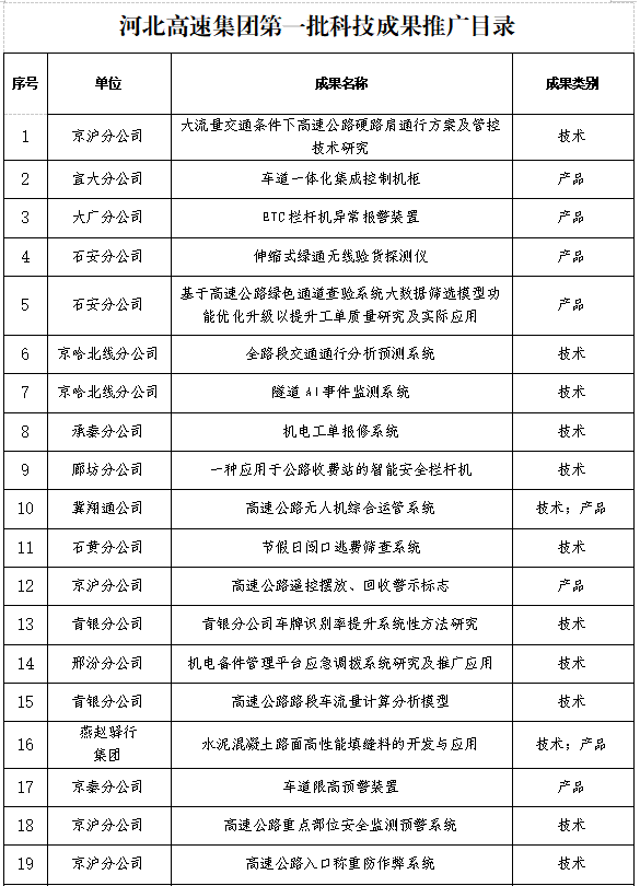 根據(jù)《河北高速公路集團(tuán)有限公司關(guān)于征集第一批科技成果推廣目錄的通知》有關(guān)要求,集團(tuán)公司組織開(kāi)展了推廣目錄的評(píng)審工作,經(jīng)集團(tuán)公司領(lǐng)導(dǎo)同意,現(xiàn)將第一批科技成果推廣目錄予以公示。