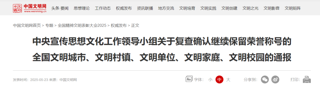 2025年5月23日,中央宣傳思想文化工作領(lǐng)導(dǎo)小組發(fā)布《關(guān)于復(fù)查確認(rèn)繼續(xù)保留榮譽(yù)稱號的全國文明城市、文明村鎮(zhèn)、文明單位、文明家庭、文明校園的通報(bào)》,河北高速公路集團(tuán)有限公司順利通過復(fù)查,連續(xù)14年保持“全國文明單位”榮譽(yù)稱號;青銀分公司2021年獲評“全國文明單位”,亦順利通過本次復(fù)查。