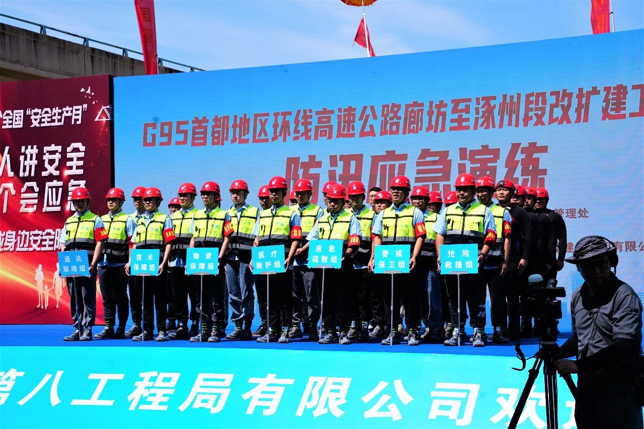 演練現場還舉行了防汛工程搶險隊成立大會,60多名防汛搶險隊隊員列隊并進行了宣誓。防汛搶險隊肩負著“項目保障+區(qū)域聯(lián)動”的雙重使命,其成立標志著G95首都地區(qū)環(huán)線高速公路廊涿改擴建項目防汛應急能力達到了新的高度。