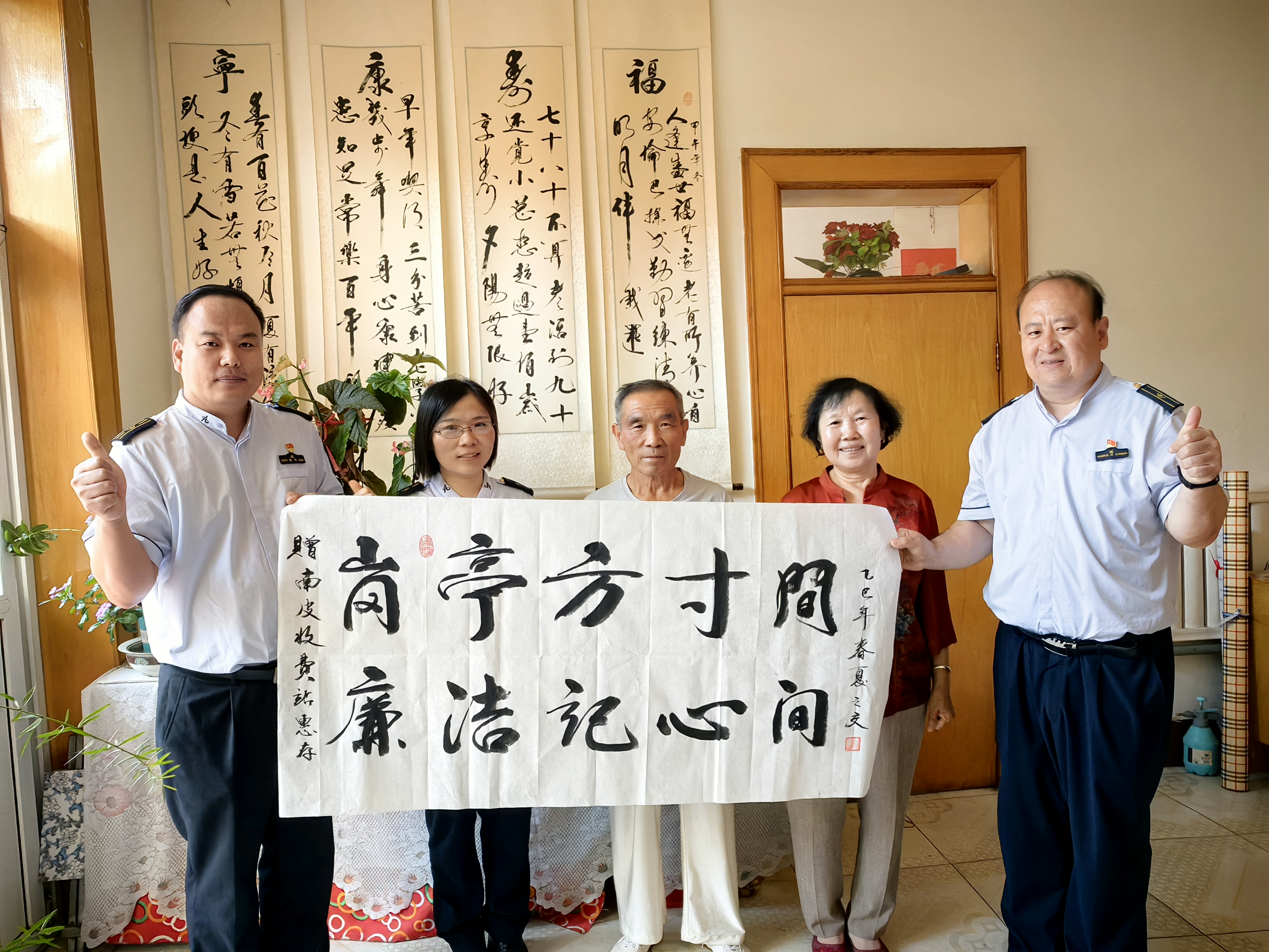此次活動由黨支部書記帶領紀檢委員、廉勤監(jiān)督員,對干部職工家庭進行走訪。詳細了解職工家庭生活狀況、思想動態(tài),認真傾聽家屬對廉潔文化建設的意見建議,闡釋“家風正則作風淳”的深刻內涵,并為職工家屬送上廉潔讀本。南皮收費站職工蔡仁花父親現(xiàn)場揮毫寫下“崗亭方寸間、廉潔記心間”的書法作品,以筆墨傳情,字里行間蘊含著家庭對廉潔文化的深刻認同,更承載著對京滬分公司發(fā)展的美好祝愿。