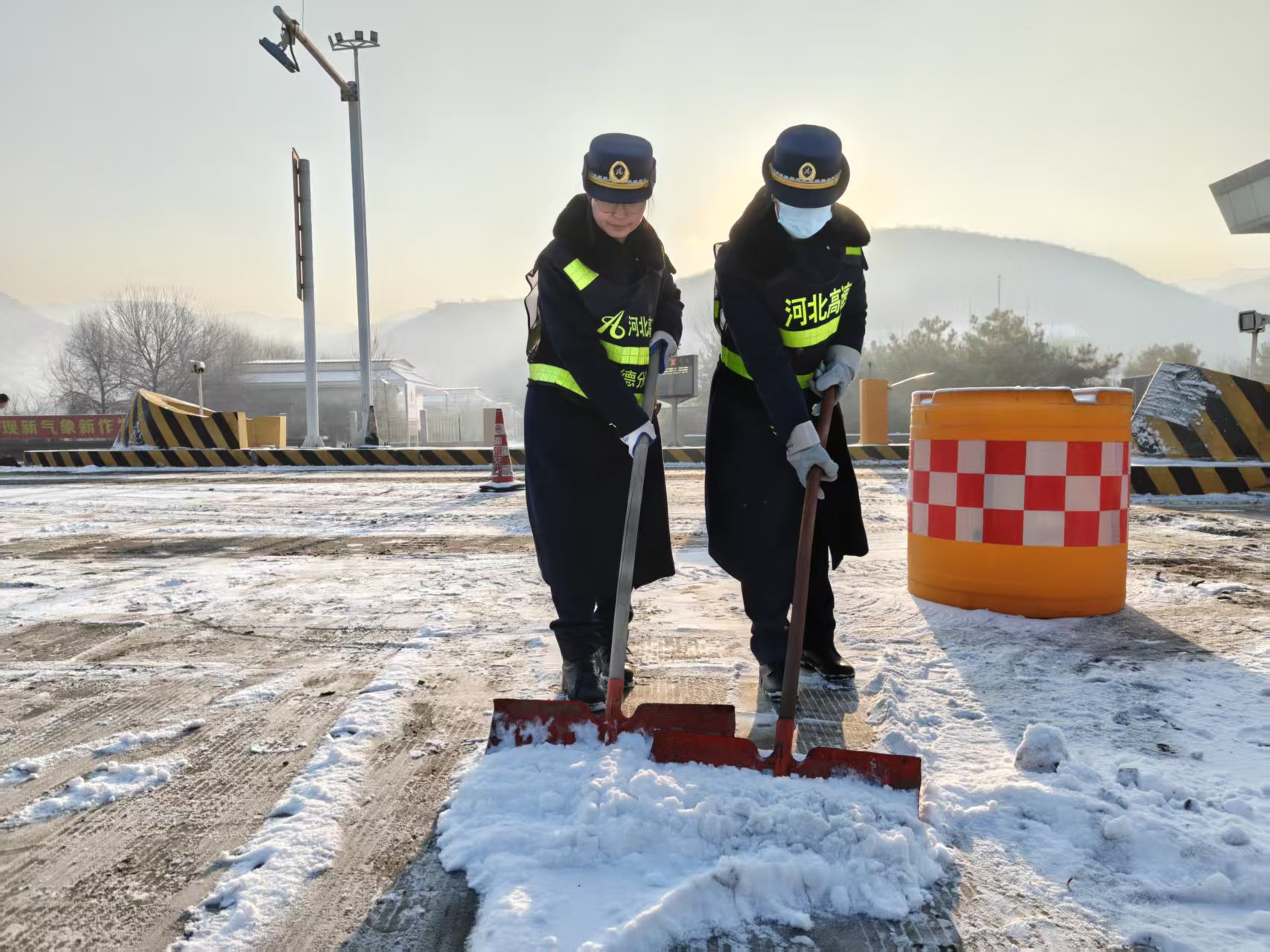一組人員重點(diǎn)清理收費(fèi)廣場及車道,另一組則負(fù)責(zé)收費(fèi)島頭、崗?fù)ぶ苓叺汝P(guān)鍵區(qū)域。大家細(xì)致清掃、不留死角,全力恢復(fù)路面整潔,保障通行條件。除雪同時(shí),職工們不忘主動(dòng)服務(wù)司乘:有的引導(dǎo)車輛有序通行,有的提醒駕駛員減速慢行,還有的為滯留人員送上熱水,在寒冬中傳遞溫暖。
