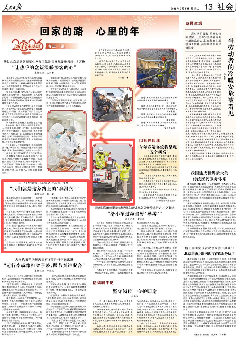 2月3日,《人民日?qǐng)?bào)》頭版報(bào)眼欄目刊發(fā)“春運(yùn)首日的四組鏡頭”(新春走基層)圖文報(bào)道,并在第13版“回家的路 心里的年”(新春走基層·春運(yùn)一線)刊發(fā)了京滬分公司春運(yùn)保通保暢工作的綜合稿件。