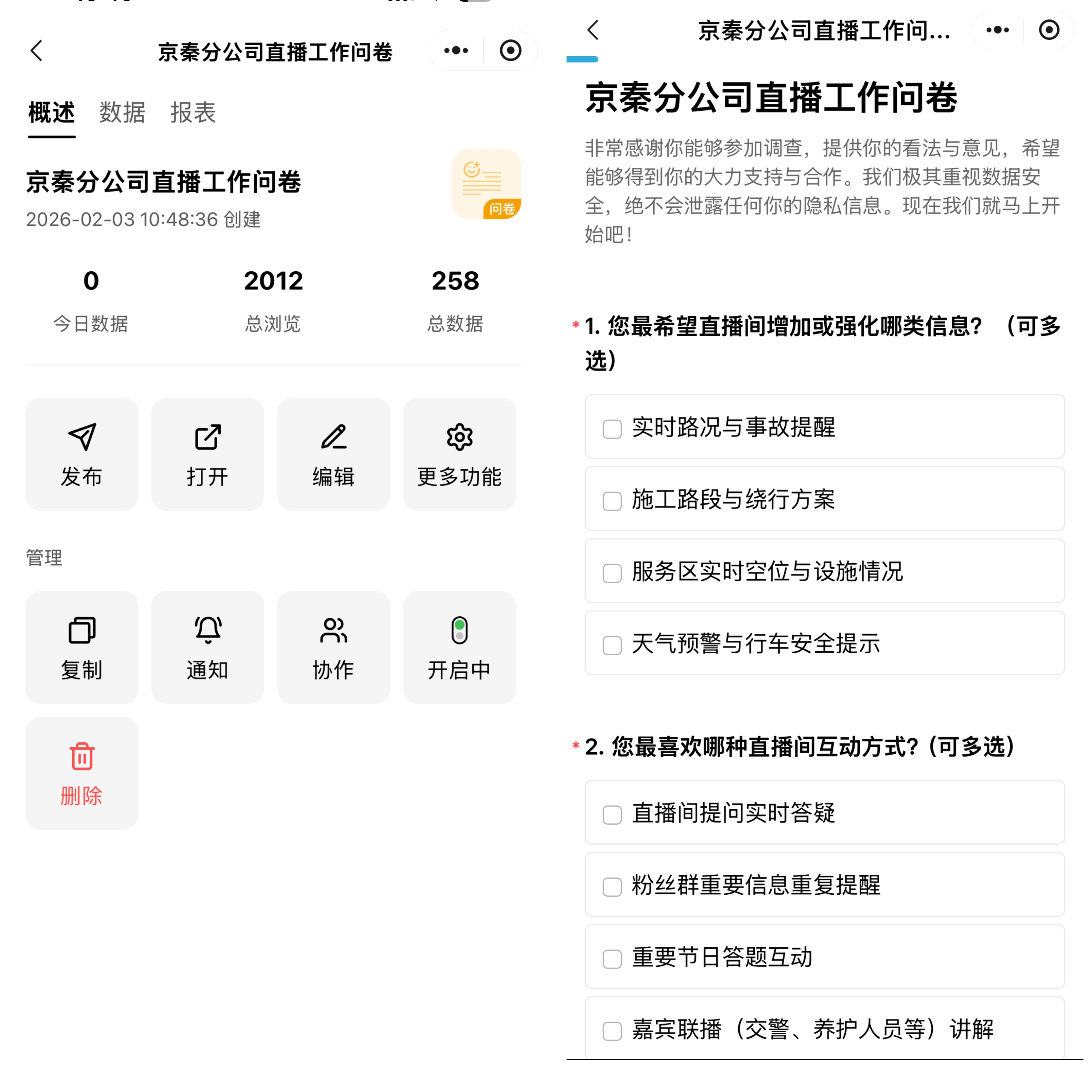 為精準服務春運出行需求,京秦分公司于2月3日至8日發(fā)起了直播專項問卷調查,共吸引2011名用戶參與。