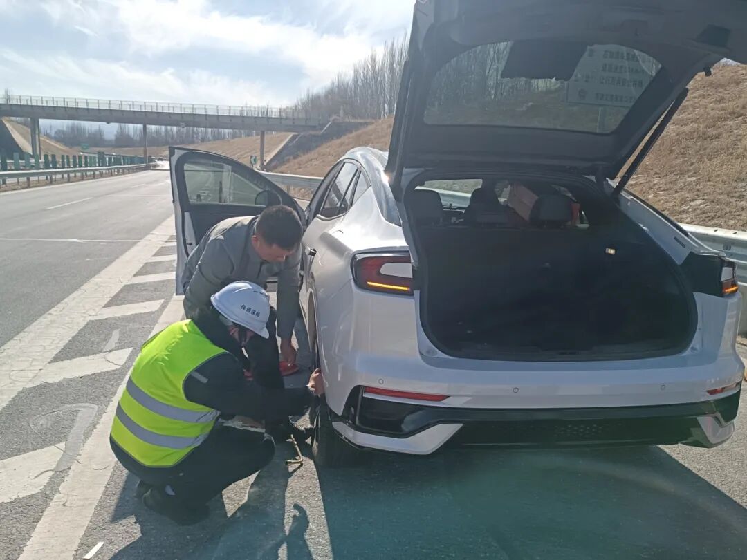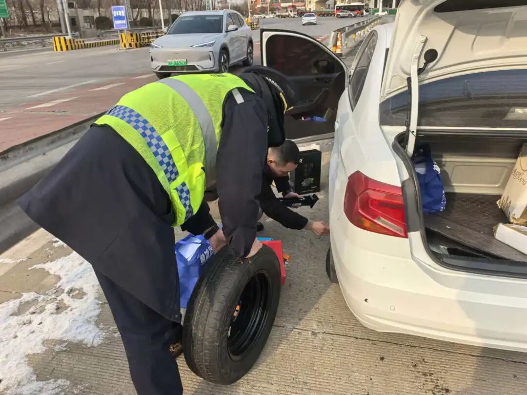 2月16日中午,大隊(duì)巡查至宣大高速 K204+500 處,發(fā)現(xiàn)一輛白色私家車停靠應(yīng)急車道,車主一家神色焦急。經(jīng)詢問(wèn),該車右后輪胎破損漏氣。巡查人員立即做好安全預(yù)警,一邊疏導(dǎo)過(guò)往車輛,一邊熟練拆卸故障輪胎、更換備胎,短短十幾分鐘便完成操作??紤]到備胎不適合長(zhǎng)途行駛,工作人員又指引其前往就近維修廠修復(fù)破損輪胎,確保車輛正常通行。