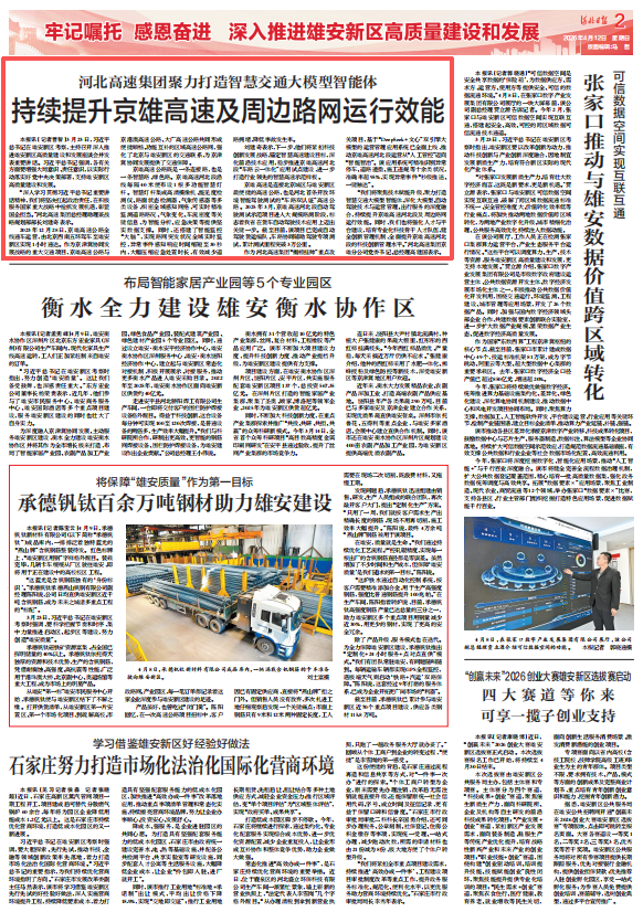 近日,河北日?qǐng)?bào)02版刊登題為“河北高速集團(tuán)聚力打造智慧交通大模型智能體 持續(xù)提升京雄高速及周邊路網(wǎng)運(yùn)行效能 ”的文章,報(bào)道了河北高速集團(tuán)以科技創(chuàng)新賦能京雄高速。