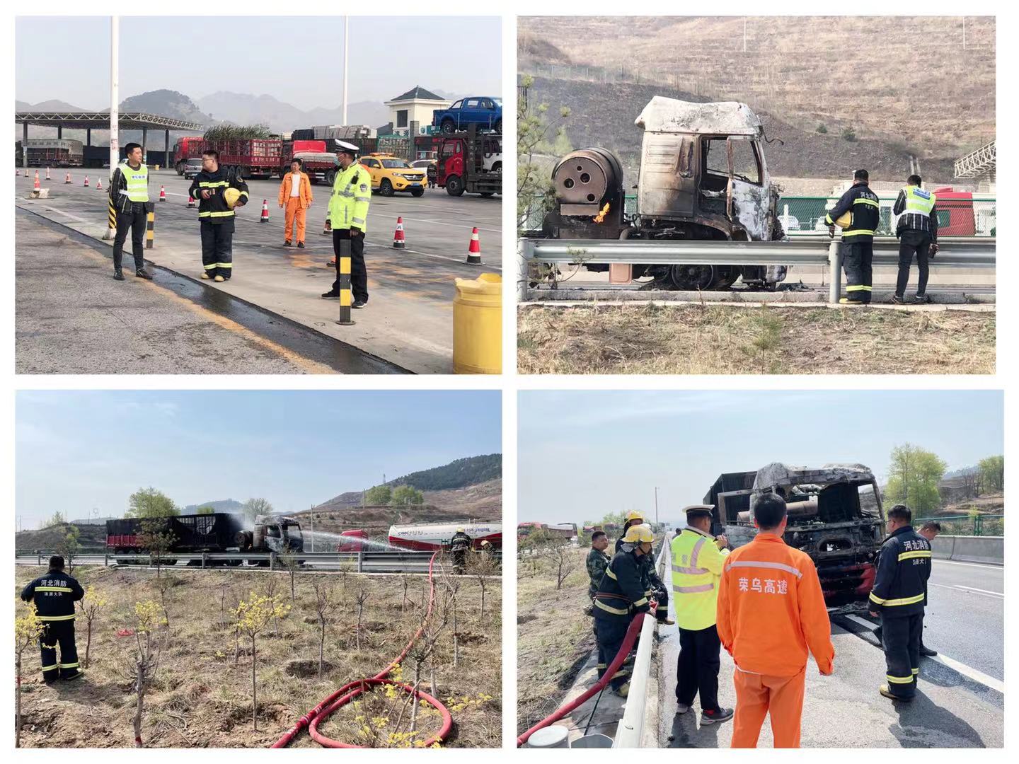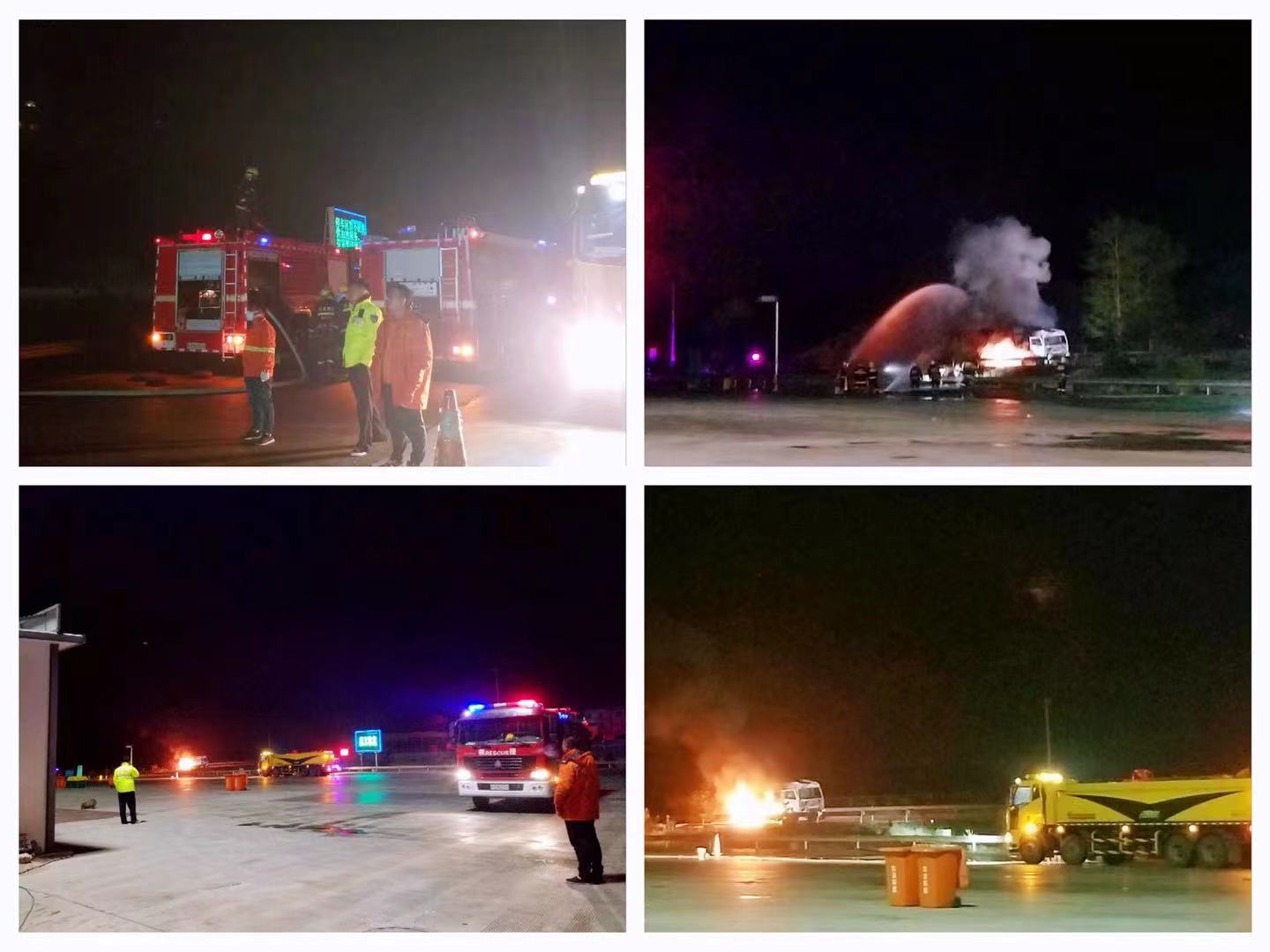 4月19日22時,榮烏高速山西方向K1003+950應(yīng)急車道與行車道之間,一輛運(yùn)送鐵粉牽引掛車發(fā)生自燃,濃煙四起,事故車主已撥打119報警,情況十分危急。接到淶源消防大隊通知后,淶源養(yǎng)護(hù)工區(qū)立即啟用應(yīng)急預(yù)案,組織人員及車輛迅速趕往現(xiàn)場,同時值班人員第一時間撥打高速交警、高速路政電話進(jìn)行救援,并將信息上報分公司領(lǐng)導(dǎo)、分公司值班室、信息調(diào)度中心。