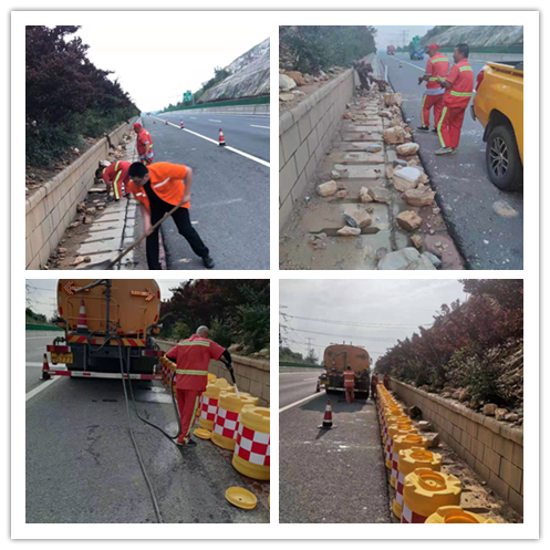 徐水養(yǎng)護工區(qū)山西方向K910上邊坡防護由于降雨導(dǎo)致大量落石灑落在應(yīng)急車道,工區(qū)在雨中巡查時就立即把灑落石頭移到應(yīng)急車道保證行車安全,降雨過后工區(qū)組織人員對石頭進行清理并在K910應(yīng)急車道連續(xù)擺放防撞桶,防止近期連續(xù)降雨高邊坡繼續(xù)落石發(fā)生交通事故,消除安全隱患,提示司乘人員安全駕駛。