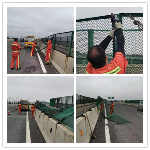 大雨過后,路面由于降雨出現(xiàn)了部分坑槽病害,為防止坑槽進一步發(fā)展影響行車安全,徐水養(yǎng)護工區(qū)立即組織人員對坑槽進行修補,保障行車安全。由于短時大風(fēng)導(dǎo)致高速紅線外樹木傾倒在應(yīng)急車道上,工區(qū)組織職工對傾倒樹木進行修剪清理,保障應(yīng)急車道通暢。大風(fēng)還導(dǎo)致商莊互通主線橋防拋網(wǎng)連續(xù)傾倒,防拋網(wǎng)傾倒以后影響快車道行車安全,工區(qū)立即對傾倒防拋網(wǎng)進行拆除,保證快車道行車安全。