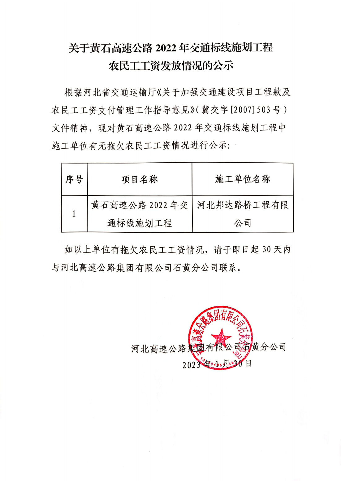 關(guān)于黃石高速公路2022年交通標(biāo)線施劃工程農(nóng)民工工資發(fā)放情況的公示