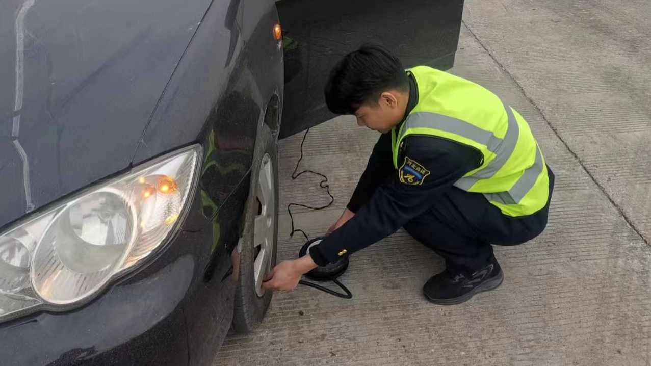 1月16日15時左右,一輛黑色小轎車駛?cè)肴幽鲜召M站出口103車道,司機繳費時向收費人員表示自己車內(nèi)胎壓警報燈亮起,詢問站區(qū)是否能夠幫忙打氣。收費員馬上用對講喊來疏導(dǎo)員,疏導(dǎo)員立即從便民服務(wù)室取出便攜打氣設(shè)備,并將車輛引至廣場安全地帶。疏導(dǎo)員協(xié)助司機用氣泵進行打氣,很快將輪胎的氣打滿。班長告訴司機師傅距離站區(qū)最近的修理廠位置,同時提醒其開車前一定要檢查好車輛,避免發(fā)生危險。司機感動地說:“你們服務(wù)真是太到位了,太謝謝你們了!”