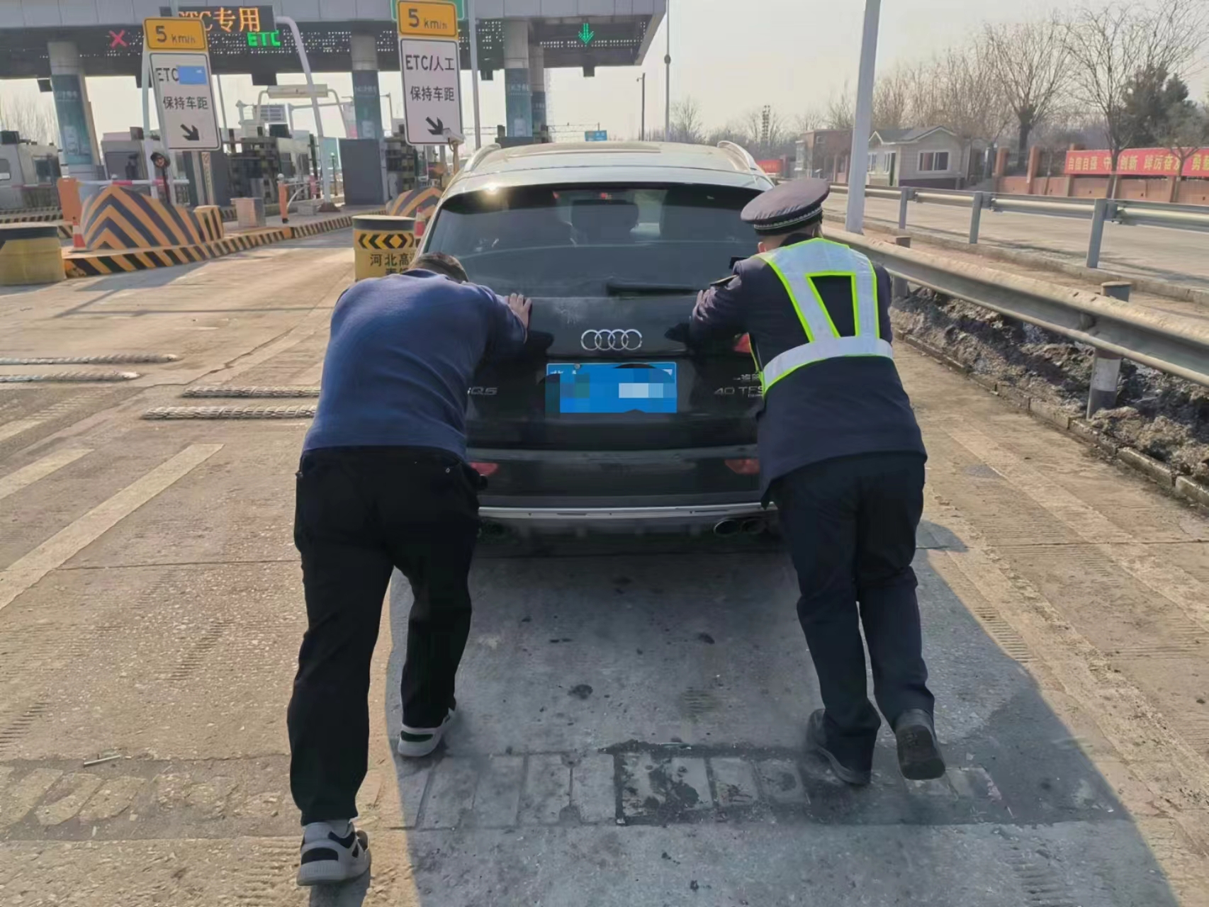 “太感謝你們了,就我一個人,幸虧有你們的幫助,不然真的不知道該怎么辦了......”這是2月25日發(fā)生在南宮收費站的溫馨一幕。當(dāng)日上午10:20,一輛冀A牌照的黑色小車在行駛到南宮站103車道前不遠(yuǎn)處突然停了下來,收費員李冰清看到后,立即上報給班長蘇雪峰,蘇雪峰連忙上前詢問,經(jīng)了解得知司機(jī)在開車途徑南宮服務(wù)區(qū)附近時就感覺到車子有故障,想就近到南宮收費站下高速查看情況,但沒成想還沒有開到繳費窗口車就不能動了,司機(jī)很是焦急。由于收費廣場車流較大,為確保安全,蘇雪峰和司機(jī)溝通,先將車推出收費廣場,然后再查看故障原因,司機(jī)表示同意。于是蘇雪峰上報給正在廣場巡查的值班站長王占京,喊來稽核員馬得青和辦事員馬超濟(jì)一同將車推至收費廣場安全位置,并在車子后方合適位置擺放反光錐,警示后方來車注意安全。