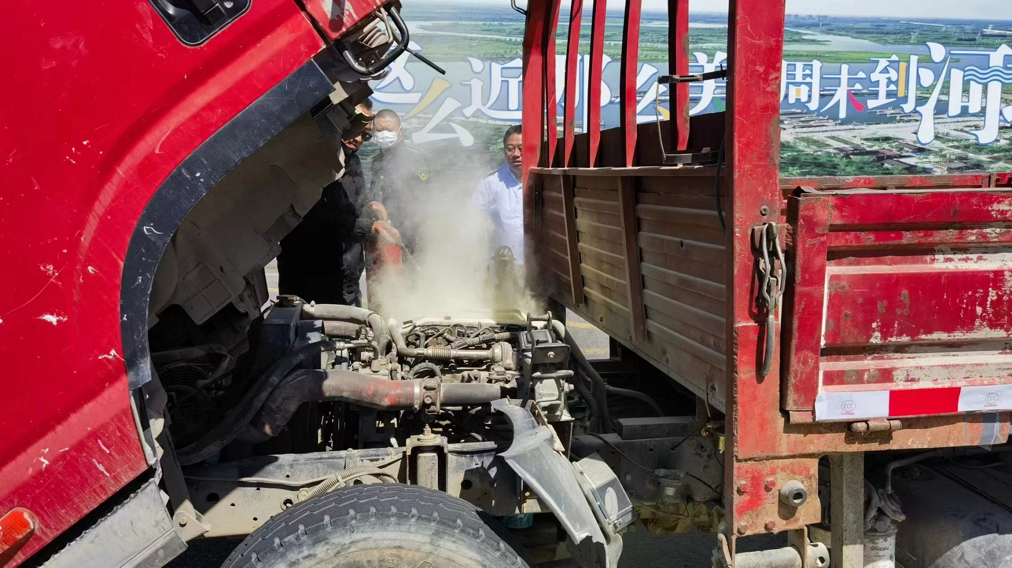 火撲滅后,班長并沒有離開,協(xié)助司機(jī)把車推到安全地帶、聯(lián)系拖車,在等待拖車的時(shí)候,班長孫海龍和司機(jī)查看貨車起火的地方尋找起火原因,原來是發(fā)動(dòng)機(jī)過熱導(dǎo)致發(fā)動(dòng)機(jī)與汽車線路板連接的電線被引燃。不一會(huì)兒,拖車到達(dá)把小貨車拖上拖車,臨走前,司機(jī)握住班長的手感激地說:“我是從北京開車去寶坻的,路上我就總聞著車?yán)镉袩z皮的味道,就知道車出問題了,趕緊就近下高速,還好有你們的幫忙,要不然我的車就燒報(bào)廢了!真的太感謝你們了!”