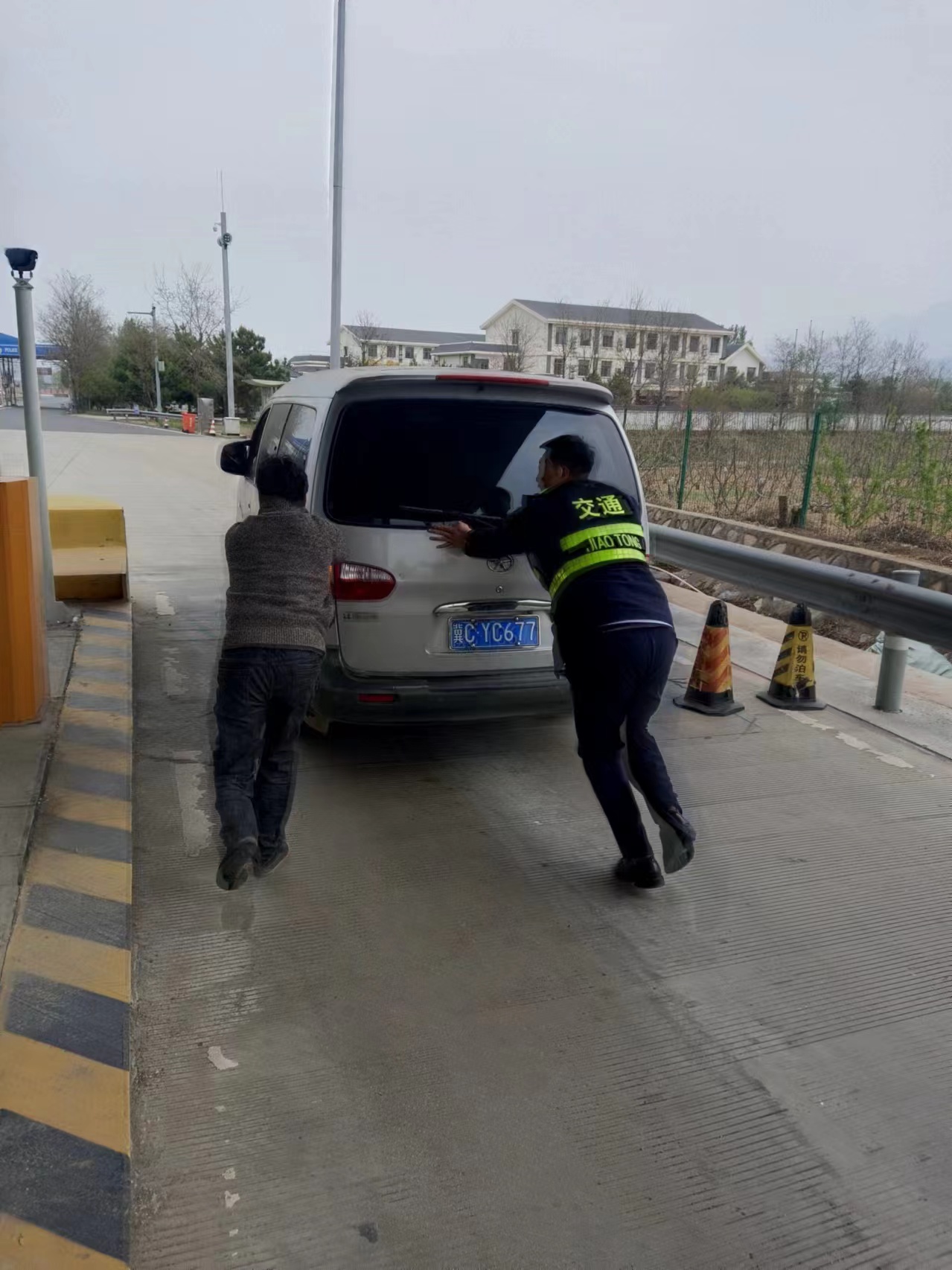 4.27日上午孫秋偉同志正在收費(fèi),這時(shí)看見收費(fèi)廣場內(nèi)有一輛大面包車行駛緩慢,便立即用對講機(jī)呼叫班長姚樞保同志,通知班長內(nèi)廣場有一輛行駛緩慢的車應(yīng)該是發(fā)生故障了,姚樞保同志立即作出反應(yīng),跑到故障車那里詢問司機(jī)情況,司乘人員說到:不好意思同志,我這車打不著火了,我把車推下來的,給你造成擁堵了實(shí)在不好意思。班長姚樞保同志講:沒事師傅,我先幫您繳費(fèi)然后在幫您把車推到外廣場等待救援吧。司乘連連感謝太謝謝了,幸虧您幫忙推車我自己已經(jīng)推不動(dòng)了,姚樞保同志幫忙把車推到外廣場后隨即又給司乘人員提供了水和救援電話。