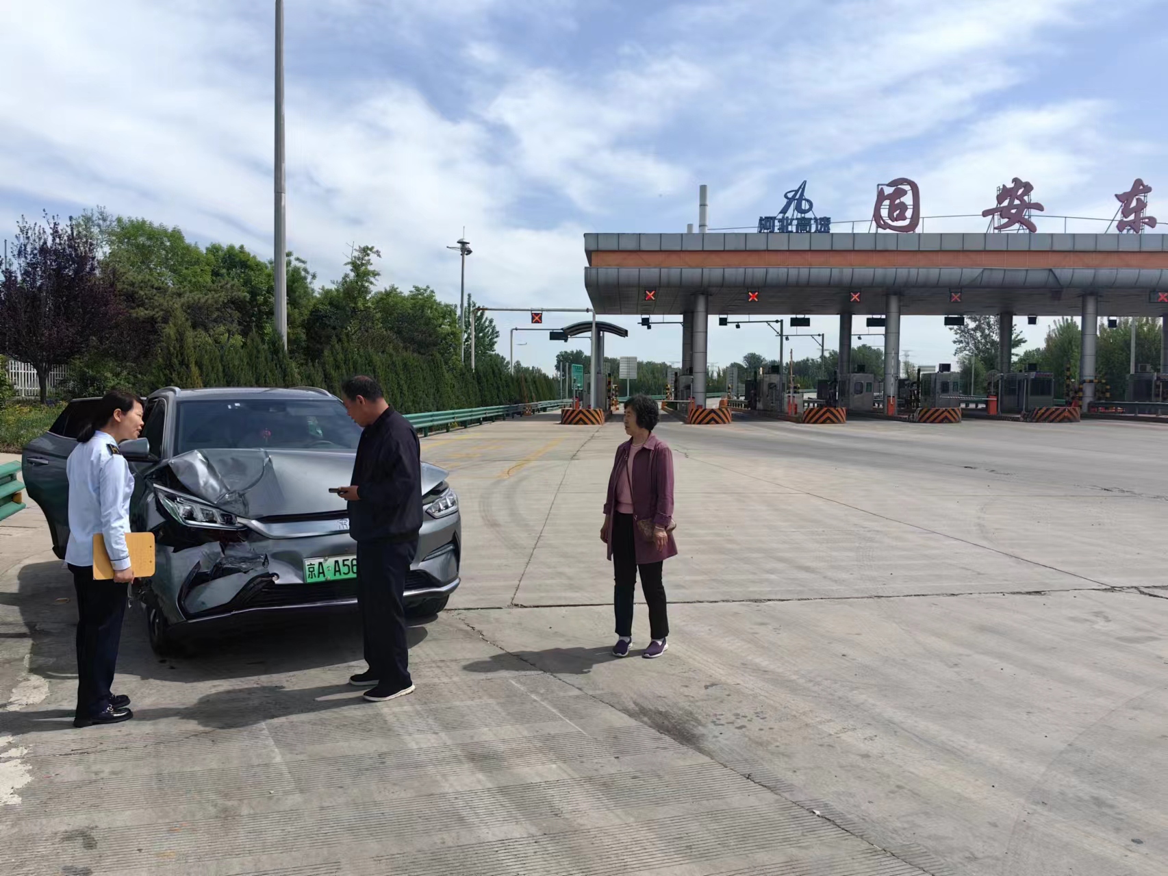 5月1日10時,值班站長耿飛飛、稽核員房海濱在日常巡查時,發(fā)現(xiàn)固安東收費站外廣場處停著一輛小型客車,有人員在車周圍徘徊,便上前詢問情況。