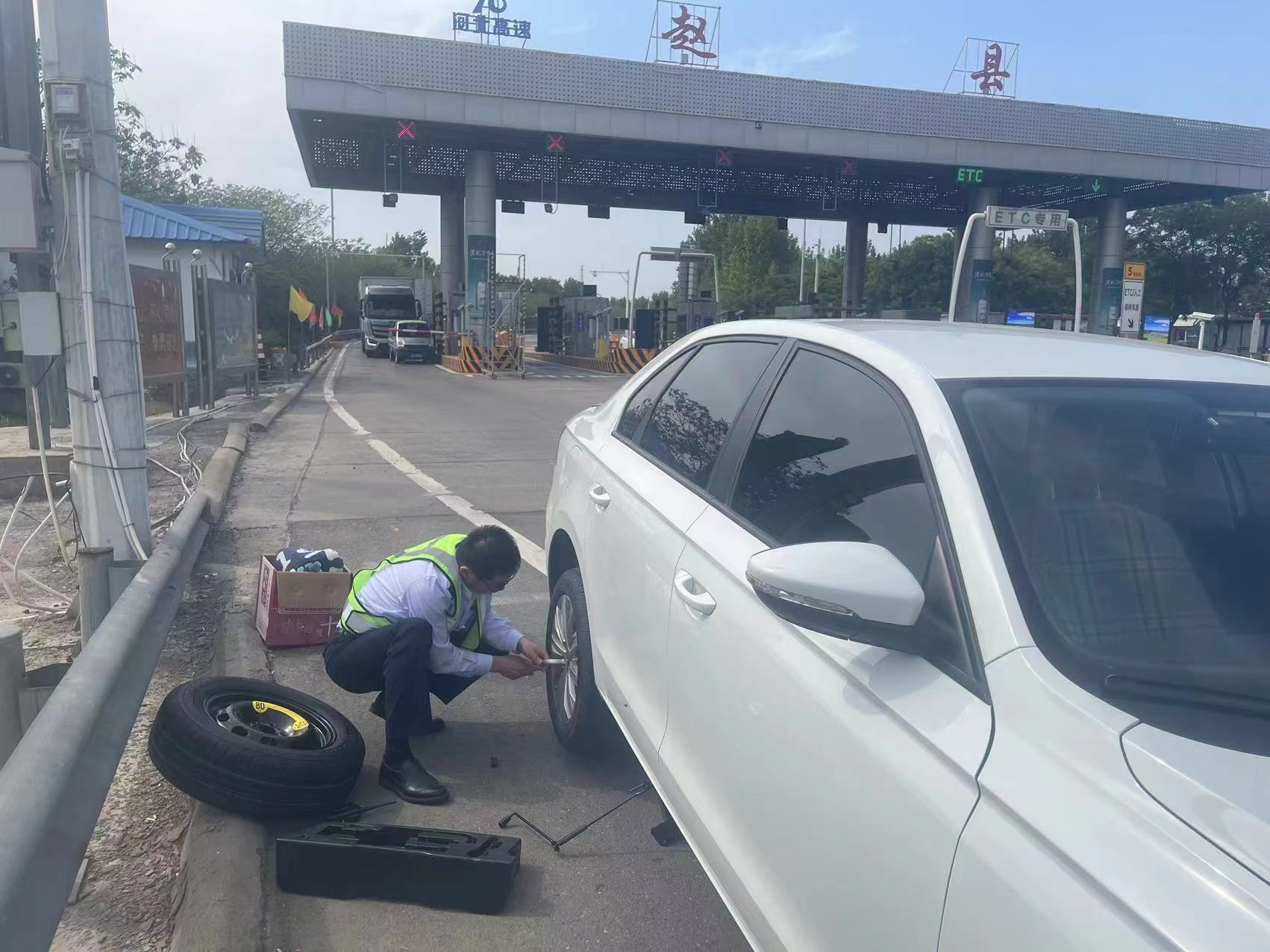 5月5日下午兩點(diǎn)左右,正值五一節(jié)假日最后一天,趙縣收費(fèi)站下道車輛較多,班長(zhǎng)李永盛正在廣場(chǎng)疏導(dǎo)車輛,此時(shí)一輛冀A牌照的小型客車在經(jīng)過(guò)李永盛身邊時(shí),司機(jī)搖下車窗詢問附近修補(bǔ)輪胎的維修點(diǎn)的位置,班長(zhǎng)李永盛看著司機(jī)焦急的神情,心里猜測(cè)肯定是這位司機(jī)師傅遇到了什么問題,他便示意司機(jī)先將車輛停靠在廣場(chǎng)安全區(qū)域,了解到該車返程途中胎壓報(bào)警,檢查發(fā)現(xiàn)輪胎扎著一枚釘子,李永盛連忙安慰司機(jī),并表示可以先幫司機(jī)更換備胎,再前往修理店,經(jīng)過(guò)一番操作,備胎很快就被換好了,司機(jī)豎起了點(diǎn)贊的大拇指,不停表示感謝,李永盛又將附近修理店地址告知司機(jī),并表示這些都是我們應(yīng)該做的,下次在高速路上遇到什么困難都可以向我們青銀收費(fèi)站求助。
