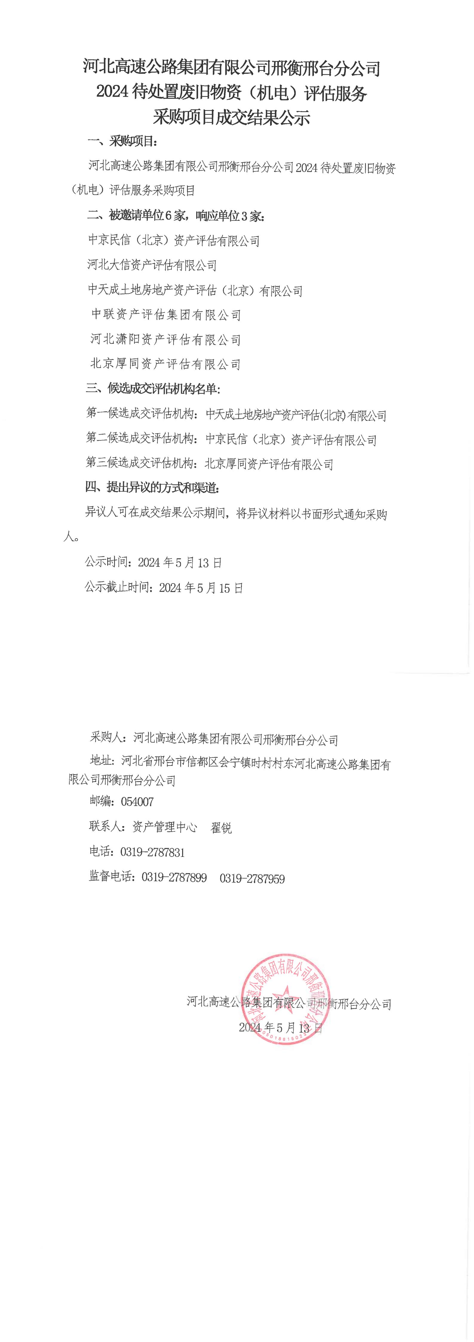 邢衡邢臺(tái)分公司2024年待報(bào)處置廢舊物資(機(jī)電)評(píng)估服務(wù)采購(gòu)項(xiàng)目成交結(jié)果公示