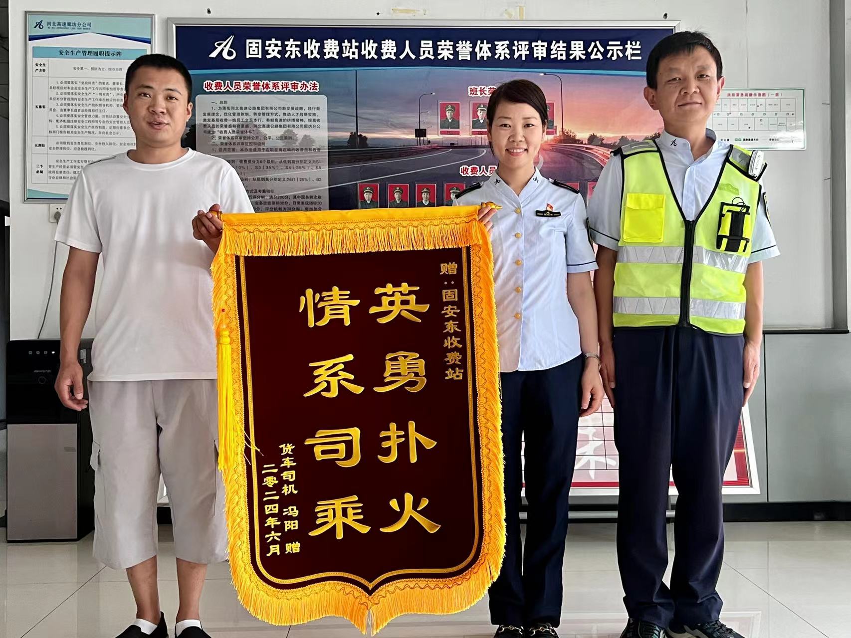 6月11日,司機(jī)在送完貨返回的途中,特意為固安東收費(fèi)站送來(lái)了“英勇?lián)浠?情系司乘”的錦旗表示感謝。一面錦旗不僅代表著司機(jī)對(duì)我們工作的感謝,更意味著一份責(zé)任和擔(dān)當(dāng)。同時(shí)也拉近了收費(fèi)站與司乘人員心與心之間的距離,樹(shù)立了良好的社會(huì)形象。