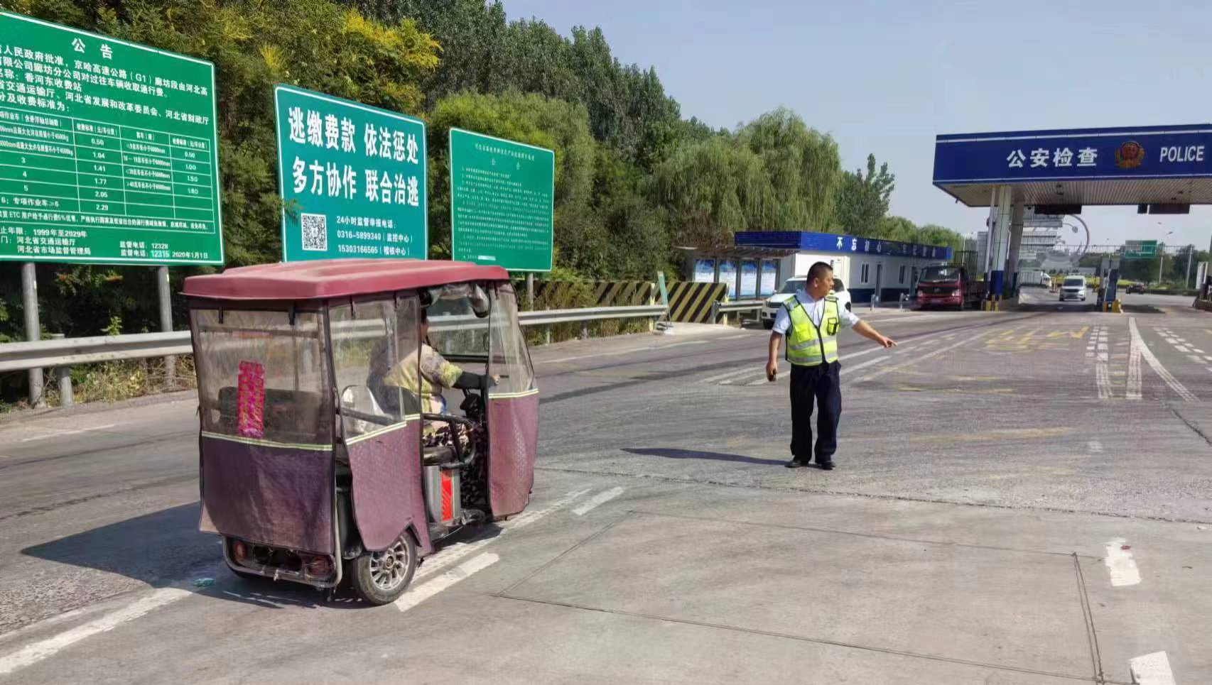 7月17日10時左右,香河?xùn)|收費站收費班長劉歡在入口車道前不遠(yuǎn)處成功攔截并勸返一輛欲上高速的電動三輪車。