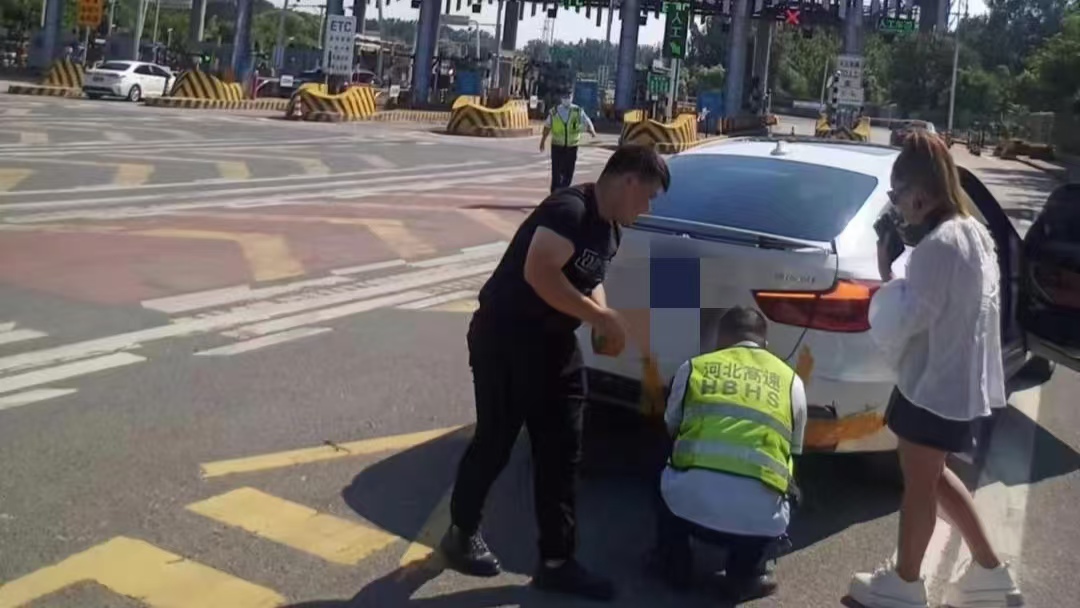 7月23日17:40,一輛冀牌照的一型小客車將車子停在了香河收費站入口廣場上,遲遲不動,過了一會兒,車上下來一名司機圍著車來回查看。