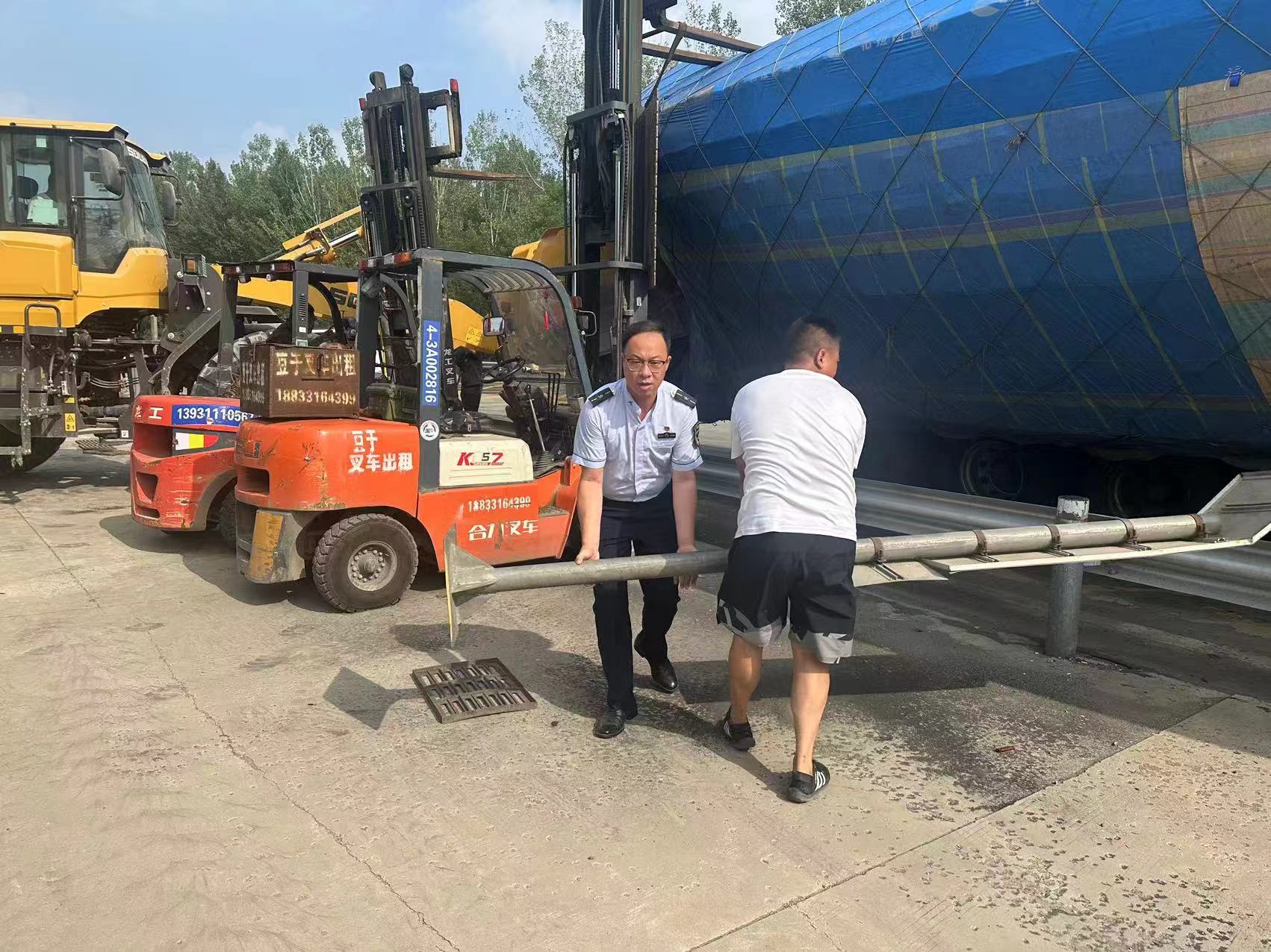 白靜強站長立刻趕到現場,與司機共同商討解決方案,考慮到貨物的特殊性和現場的不安全因素,白站長第一時間幫助司機聯系附近的叉車和鏟車,以便將傾斜的貨物重新整理歸位。正逢伏天高溫悶熱天氣,離等待救援車輛還需要一段時間,工作人員將司機引領愛心驛站休息,并為他們送上清涼的礦泉水,安撫司機焦慮的心情。二十分鐘后叉車到達現場,在工作人員的幫助下,大家齊心協力將貨物重新歸位,司機萬般感謝后駛離收費站。