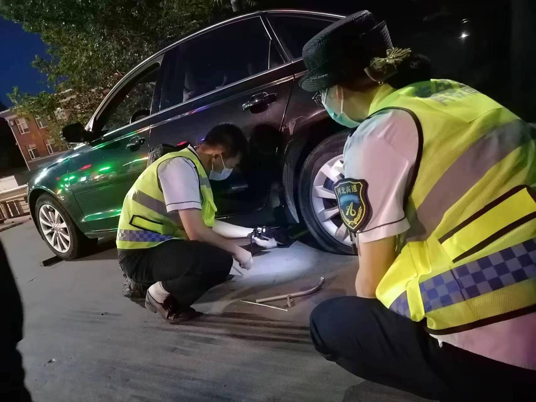 經(jīng)詢問(wèn)司機(jī)得知由于貨車拐彎時(shí)存在盲區(qū)的原因,導(dǎo)致一輛貨車和一輛小車追尾。由于事故位置在下道廣場(chǎng)ETC車道入口處,嚴(yán)重影響下道車輛的正常通行,為不造成堵車情況,蓋南立刻和高速交警大隊(duì)進(jìn)行聯(lián)系并對(duì)事故現(xiàn)場(chǎng)進(jìn)行拍照留存,同時(shí)在事故車輛后方放置反光錐和三腳架,確保其他車輛安全通行。同時(shí)為車內(nèi)司乘人員提供安全位置進(jìn)行休息。20分鐘后高速交警趕到現(xiàn)象進(jìn)行相關(guān)處理工作。高速交警處理完成后,貨車司機(jī)駛離收費(fèi)站,小車司機(jī)因車胎損壞需要人員幫忙更換輪胎。見此情況蓋南立即組織人員將車輛推至下道廣場(chǎng)安全位置,疏導(dǎo)員田文保自告奮勇說(shuō):“我來(lái)幫您更換?!苯?jīng)過(guò)半個(gè)小時(shí)的時(shí)間,備胎更換成功。司機(jī)對(duì)欒城收費(fèi)站的大力幫助給與高度贊揚(yáng)。