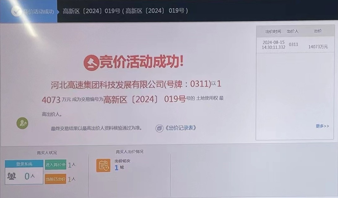 8月15日,河北高速集團(tuán)資源開(kāi)發(fā)運(yùn)營(yíng)有限公司所屬河北高速集團(tuán)科技發(fā)展有限公司參加了石家莊高新區(qū)〔2024〕019號(hào)地塊的國(guó)有建設(shè)用地使用權(quán)拍賣(mài)出讓活動(dòng),最終以14073萬(wàn)元的價(jià)格成功競(jìng)得該地塊,代表著河北高速集團(tuán)電子科技產(chǎn)業(yè)園項(xiàng)目的實(shí)施邁出堅(jiān)實(shí)一步。競(jìng)拍成功后,公司負(fù)責(zé)人現(xiàn)場(chǎng)與石家莊市自然資源和規(guī)劃局簽訂了土地成交確認(rèn)書(shū)。