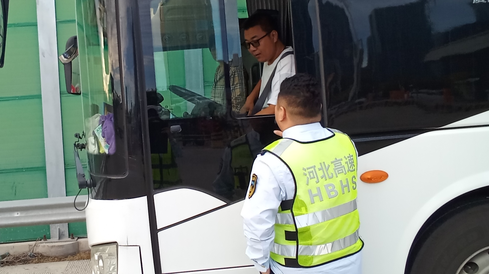 9月15日上午8時,一輛大客車在燕郊西收費站105道繳費后滯留在收費廣場,疏導員立即上前詢問情況,并引導車輛??康桨踩恢?。