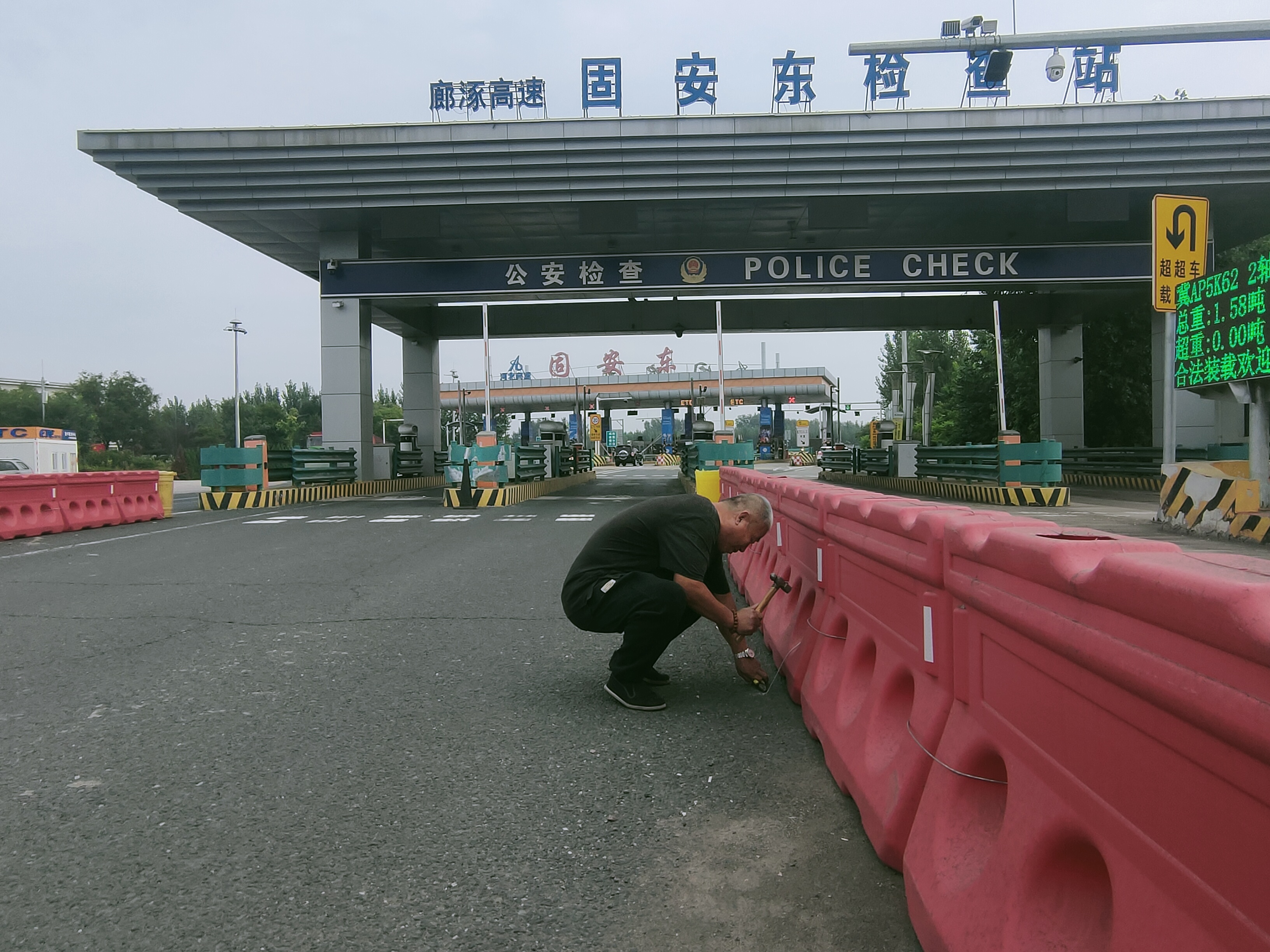 9月24日凌晨5點多突降大雨伴隨著6級大風,固安東收費站外廣場的水碼被大風吹散,散落在外廣場各處,給車輛出行帶來不便。班長冒雨出去進行擺放,反復(fù)幾次都被大風吹倒。最后只能將水碼放在外廣場引導(dǎo)車道兩側(cè)。