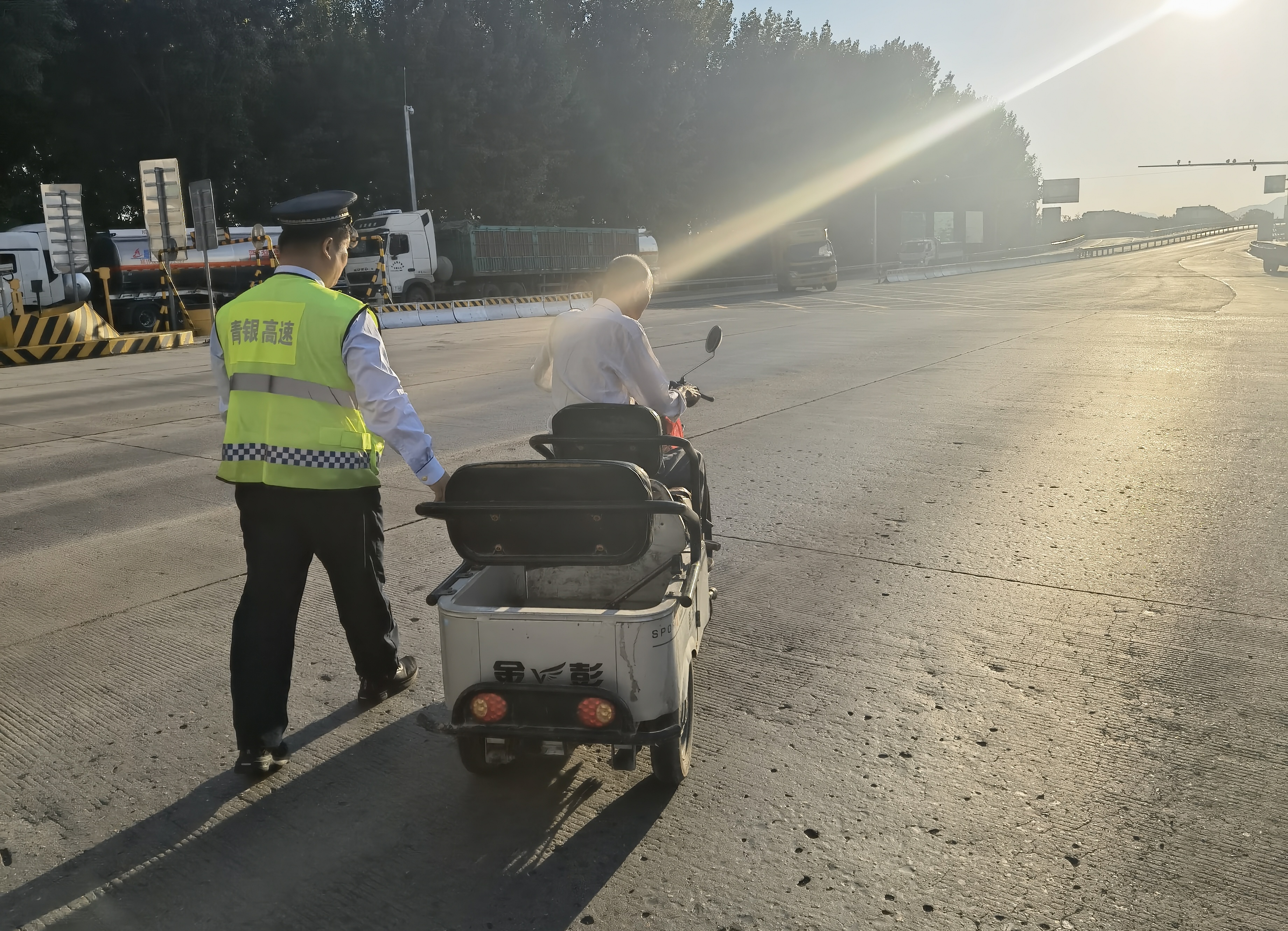 9月21日下午17點左右,竇嫗收費站收費三班疏導員忙碌地疏導車輛,發(fā)現(xiàn)一位老人騎著電動三輪車,隨著車流駛入車道。疏導員迅速上前攔截,示意老人靠邊停車,將其帶到收費站安全區(qū)域。