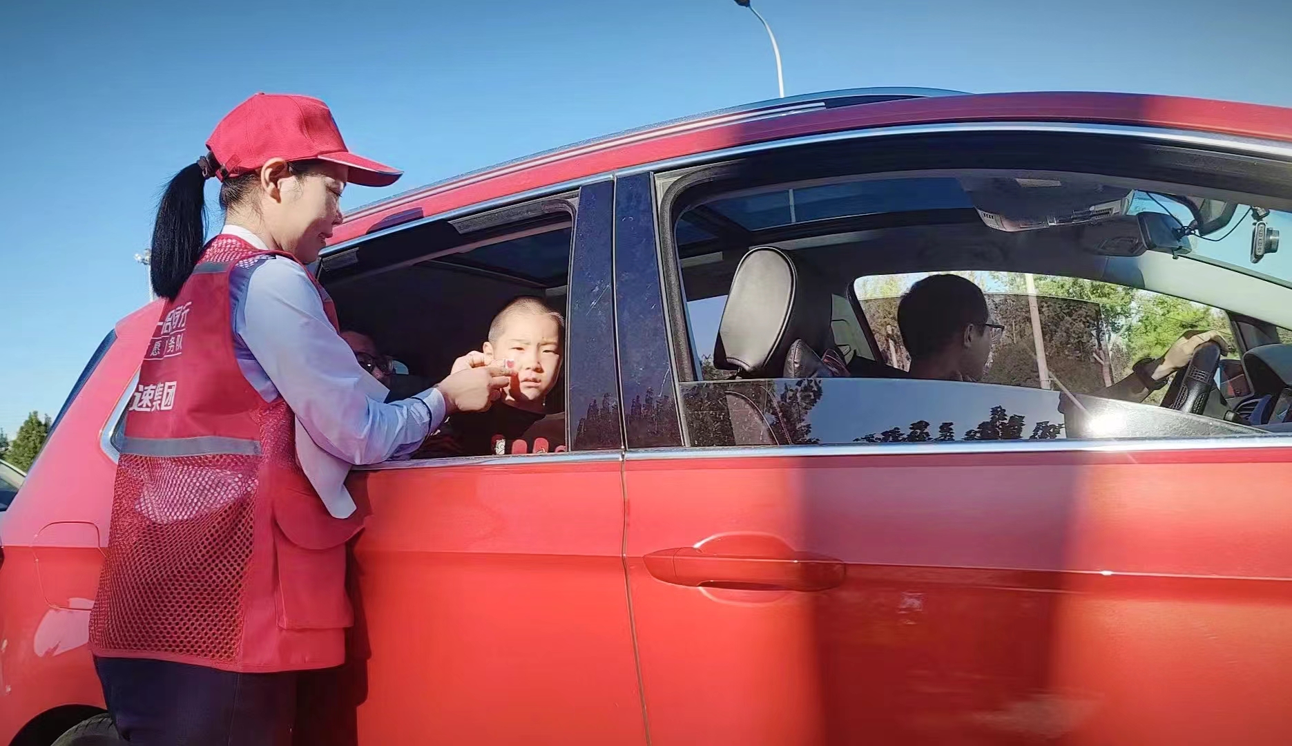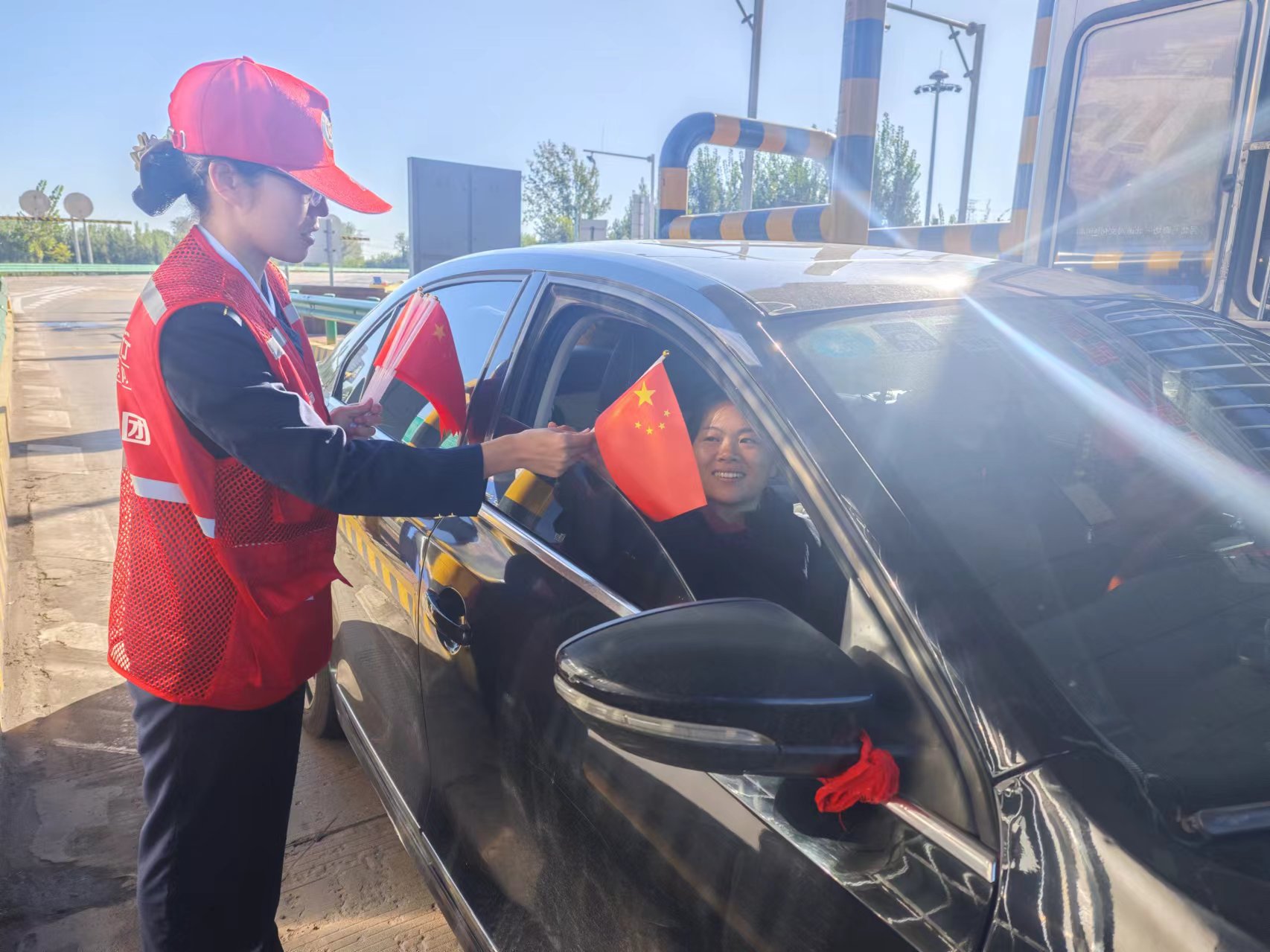 送祝福。固安東收費(fèi)站工作人員為過(guò)往司乘人員發(fā)放手持國(guó)旗、愛(ài)國(guó)貼紙,并為司乘提供路線指引、政策答疑和安全提示等服務(wù)。積極向上、簡(jiǎn)明真誠(chéng)的祝福語(yǔ),不僅為過(guò)往司乘提供了溫暖,更表達(dá)出自身禮贊祖國(guó)、感恩時(shí)代的美好心愿。此次迎國(guó)慶送祝?;顒?dòng)得到了過(guò)往司乘人員的高度評(píng)價(jià),許多司乘人員表示固安東收費(fèi)站的這一舉動(dòng)讓他們感受到了濃濃的節(jié)日氛圍和深深的愛(ài)國(guó)情懷,為固安東收費(fèi)站的貼心服務(wù)點(diǎn)贊。