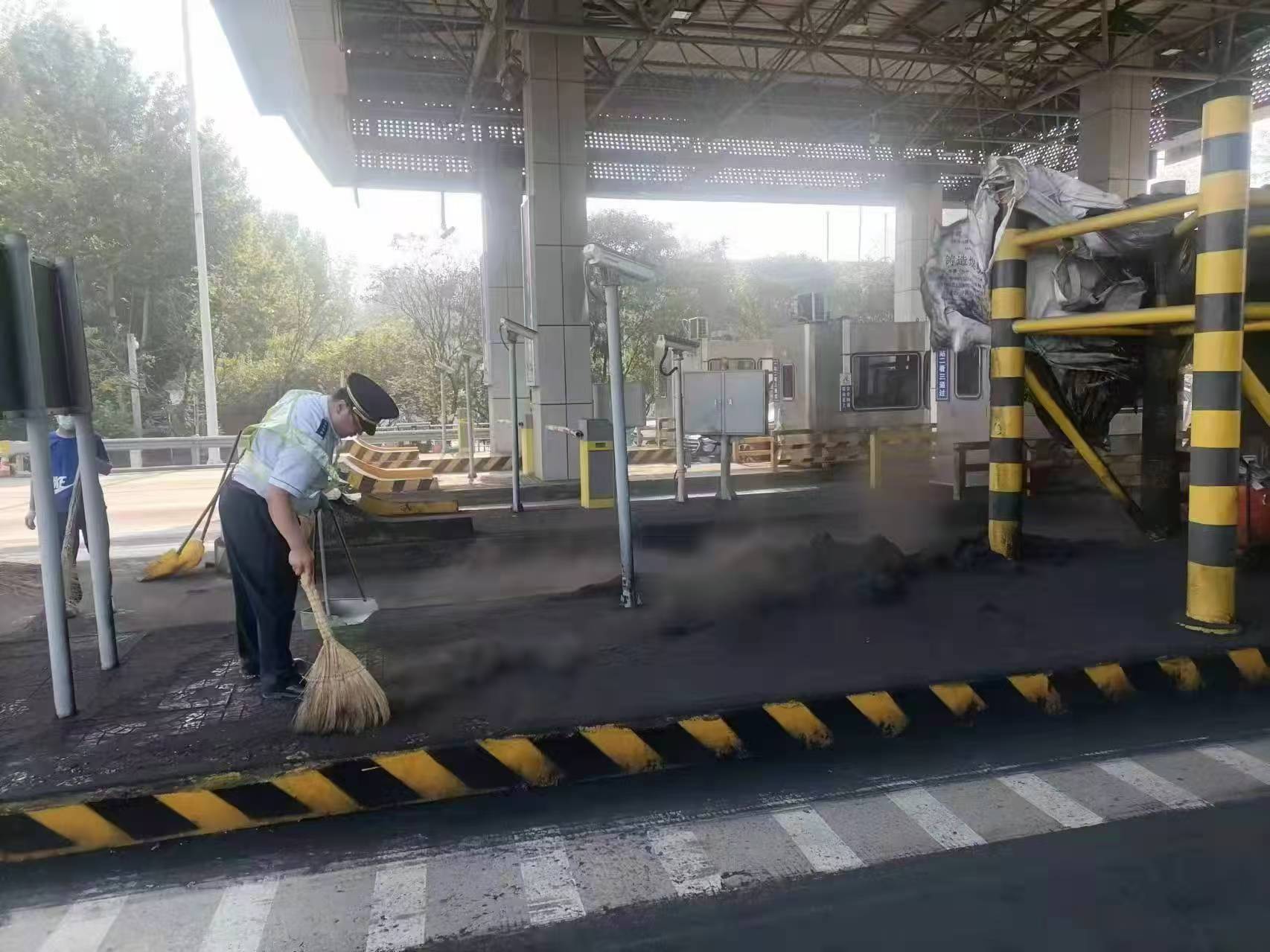 2024年10月2日,國(guó)慶節(jié)小長(zhǎng)假第二天,假期車輛臨近峰值,欒城收費(fèi)站收費(fèi)三班正在緊張有序的進(jìn)行收費(fèi)作業(yè)。突然對(duì)講機(jī)傳出:“班長(zhǎng)班長(zhǎng)!101車道車輛剮蹭防撞柱,黑煙四起什么都看不清了?!甭?dòng)嵵蛋嗾鹃L(zhǎng)和班長(zhǎng)立即趕到現(xiàn)場(chǎng),經(jīng)查看一輛裝載煤粉的重型貨車在通過(guò)車道時(shí)由于經(jīng)過(guò)長(zhǎng)途跋涉貨物裝載發(fā)生傾斜,導(dǎo)致通過(guò)車道時(shí)與防撞柱發(fā)生剮蹭,其中四袋煤粉包裝嚴(yán)重破損,黑色的煤粉撒落在車道內(nèi)一瞬間黑霧彌漫,這突如其來(lái)的狀況讓司機(jī)不知所措。值班站長(zhǎng)迅速發(fā)出指令:立即關(guān)閉101車道,在車道前方放置反光錐;疏導(dǎo)人員在101車道前方進(jìn)行疏導(dǎo),確保其他車輛有序通行;集合所有后勤值班人員穿好反光背心,多帶兩層口罩到車道進(jìn)行貨物收集工作。