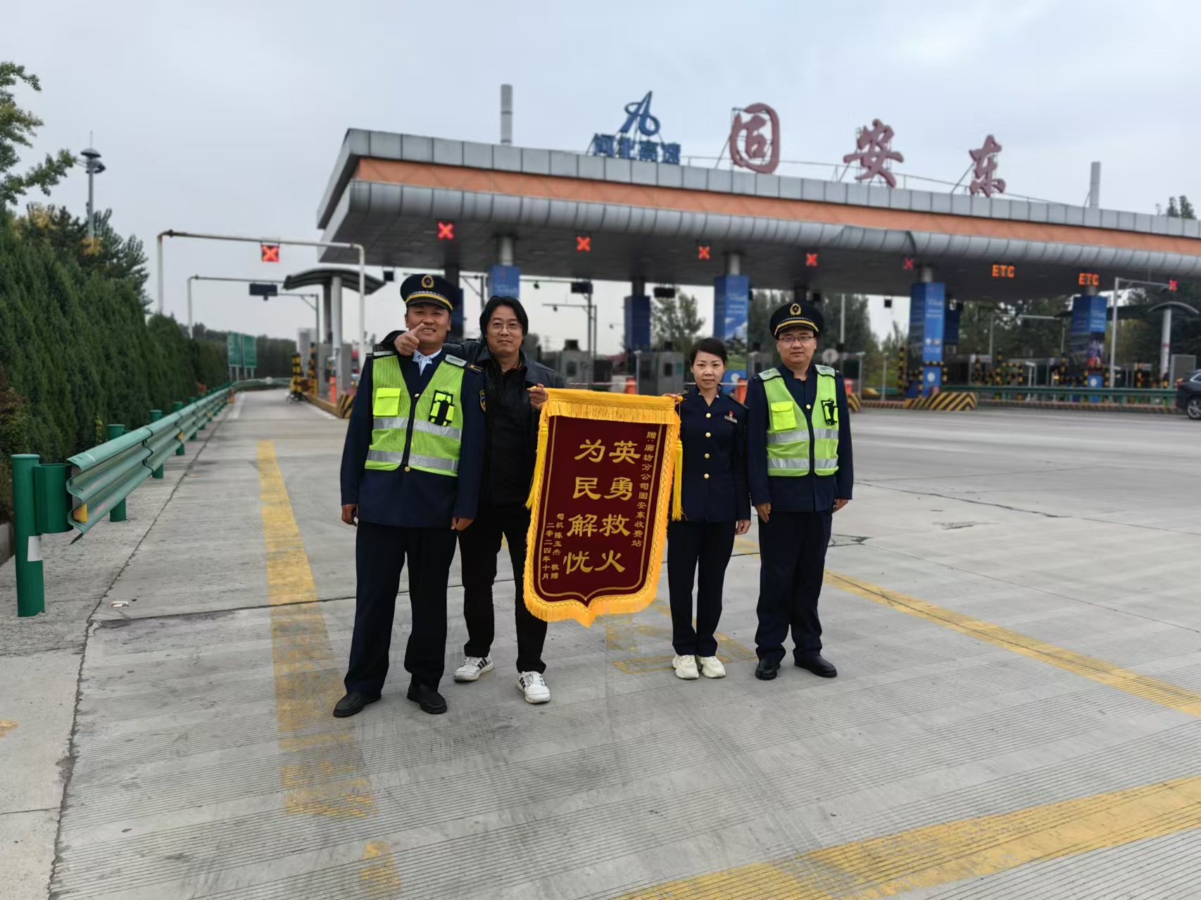 劉星認(rèn)出了這位司機,立刻明白了情況,喊來了值班站長耿飛飛對司機進(jìn)行了接待和感謝。耿飛飛看著錦旗上的“英勇救火 為民解憂”八個大字,對司機說:“您的到來,不僅是對劉星和金萬磊等工作人員英勇行為的肯定,更是對整個固安東收費站乃至河北高速系統(tǒng)服務(wù)質(zhì)量的認(rèn)可。這不僅是對過去工作的表彰,也是對我們未來工作的鼓勵和期望。