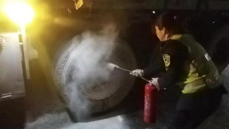 當(dāng)班班長接到通知后,立即組織人員趕往現(xiàn)場滅火,到達(dá)現(xiàn)場后,幾人熟練地將滅火器對準(zhǔn)起火點(diǎn)噴射,在使用了數(shù)個滅火器后終于將火源徹底撲滅。隨后,收費(fèi)員又拎來幾桶水對起火輪胎進(jìn)行降溫。由于發(fā)現(xiàn)及時、處置得當(dāng),一場事故被有效控制,司乘人員的生命財(cái)產(chǎn)安全未受到損害。驚慌失措的駕駛員見到火被撲滅,這才回過神來,激動不已地連連道謝。