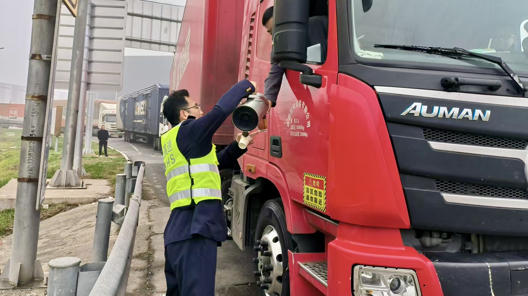 “師傅,您喝點(diǎn)熱水吧,還有什么需要幫助的您隨時(shí)跟我們說。”在崗工作人員帶著暖壺來到收費(fèi)站外廣場(chǎng),為滯留司乘倒?jié)M熱水,耐心解釋交通管制原因,安撫滯留人員焦慮情緒,并在現(xiàn)場(chǎng)設(shè)立“便民服務(wù)臺(tái)”,為司乘人員提供醫(yī)藥箱、維修工具、充電器等便民設(shè)施,同時(shí)疏導(dǎo)滯留車輛有序???,確保解除管制后車輛快速安全通過。
