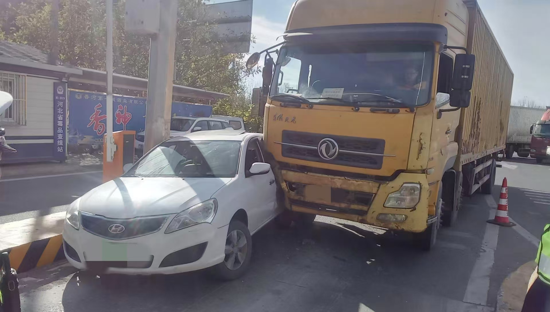 2024年11月4日13時(shí)16分,正值香河收費(fèi)站入口車流量高峰時(shí)段,收費(fèi)班長正在疏導(dǎo)車輛,只聽“砰”的一聲巨響,原來是入口計(jì)重車道發(fā)生了交通事故,一輛大貨車撞上了一輛小客車,收費(fèi)班長趕到現(xiàn)場發(fā)現(xiàn)小客車被大貨車死死頂在車道船島入口動(dòng)彈不得。