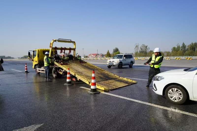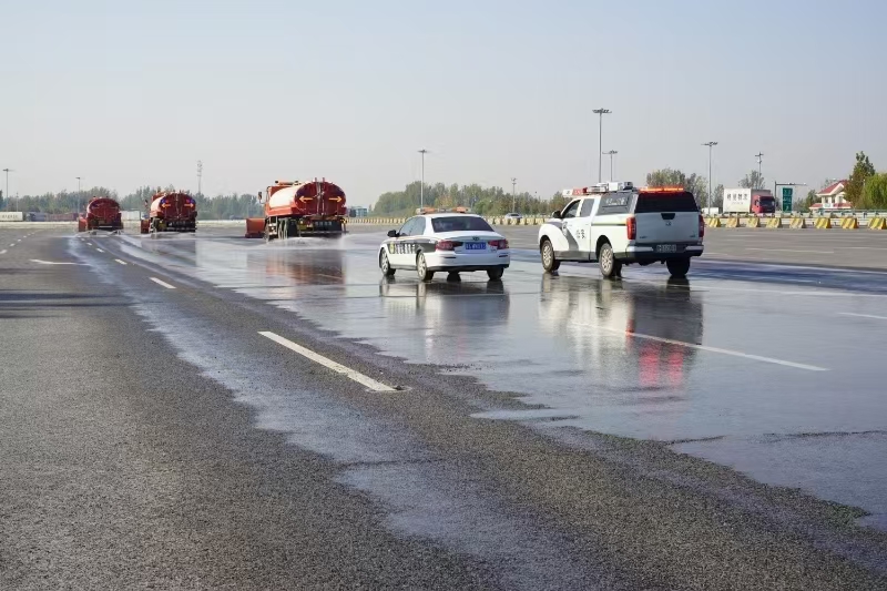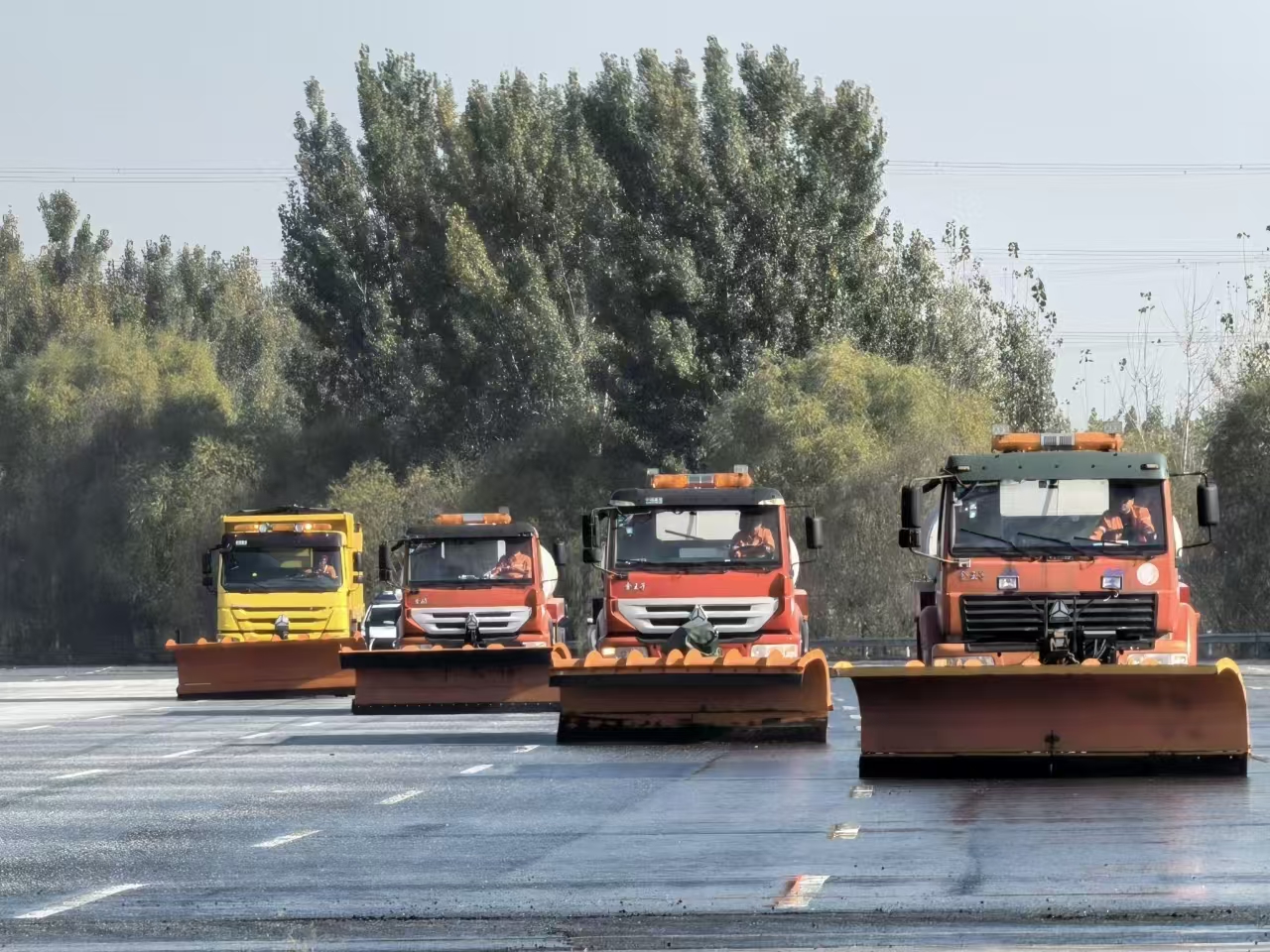 本次演練以實(shí)戰(zhàn)為主,以實(shí)用為先,通過實(shí)際操作檢驗(yàn)設(shè)備運(yùn)行狀況和各單位協(xié)同能力,為除雪保暢工作夯實(shí)基礎(chǔ)。參演車輛包括固態(tài)撒布車1輛、液態(tài)灑布車3輛、除雪鏟4臺(tái)、預(yù)警車輛3輛、救援車1輛。演練模擬沿線路段出現(xiàn)的降雪天氣,按照降雪各階段除雪作業(yè)流程,通過液態(tài)融雪劑灑布作業(yè)、固態(tài)融雪劑撒布作業(yè)、鏟雪車梯隊(duì)推雪作業(yè),預(yù)警車輛預(yù)警、壓車帶道作業(yè),事故車輛救援作業(yè)等,相互配合完成除雪演練,檢驗(yàn)了除雪預(yù)案的科學(xué)性、實(shí)用性和可操作性,磨合了除雪保暢相關(guān)單位、部門和人員的協(xié)調(diào)聯(lián)動(dòng),鍛煉了除雪保暢隊(duì)伍在惡劣天氣時(shí)應(yīng)急處置的能力。