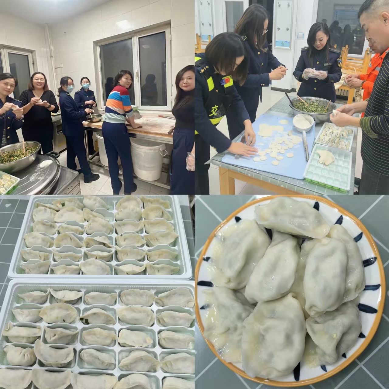 廚師提前準(zhǔn)備好了食材,調(diào)好了豬肉白菜和韭菜雞蛋兩種餡料?;顒又?,大家熱情高漲,分工明確,發(fā)揮個人所長,有調(diào)餡的、有剝蒜的、有搟面皮的、有包餃子的。大家一邊干活,一邊聊起老家過冬的情景,餃子仿佛帶著大家穿越時空回到無憂無慮的小時候。經(jīng)過一個多小時的努力,一盤盤熱氣騰騰的餃子終于出鍋了。大家圍坐在一起,品嘗著自己親手制作的餃子,感受著冬至的溫暖與歡樂。