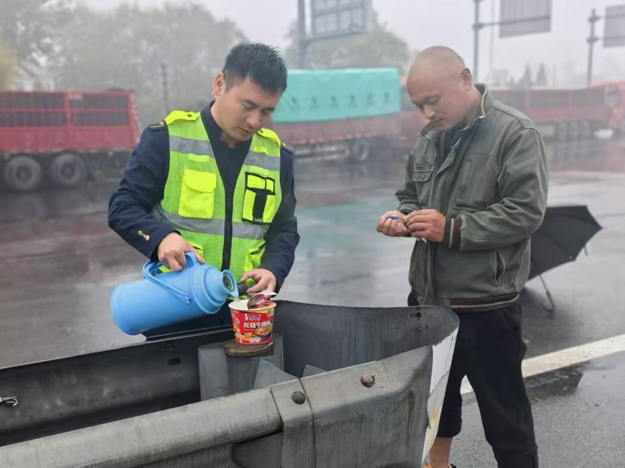 值班領(lǐng)導(dǎo)組織職工為司乘人員準備了桶面、火腿腸、雞蛋等簡易食品,供司乘朋友食用。同時,工作人員主動與司乘人員溝通,了解他們的需求與困難,耐心解答疑問,并詳細解釋站口管控情況,努力安撫大家的情緒。