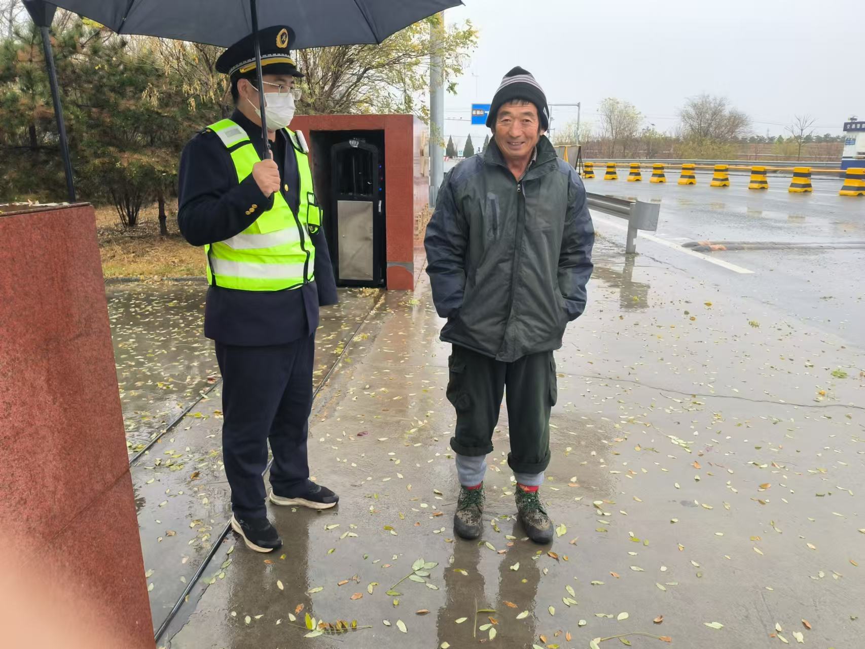 一夜雨落,氣溫驟降。11月25日上午,蔣福山收費(fèi)站當(dāng)班收費(fèi)班長(zhǎng)在巡查時(shí)發(fā)現(xiàn)出口外廣場(chǎng)有位衣著單薄的行人來回踱步。班長(zhǎng)趕忙上前詢問,原來這是位準(zhǔn)備坐大巴車回老家的外來務(wù)工人員,在詢問清楚大巴車到來時(shí)間后,班長(zhǎng)將他帶到便民服務(wù)崗?fù)?,讓其在此安心等車。隨后,班長(zhǎng)打開空調(diào),又貼心地為其倒來開水,熱氣騰騰的水讓其暖了手,更暖了心。他連聲道謝,眼中滿是感動(dòng)。