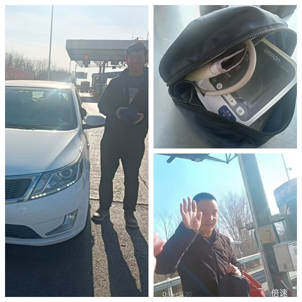 經(jīng)過詢問得知,原來車主上午把家里老人送到親戚家串親,可自己單位臨時有急事需要出差去江蘇,返回時忙中出錯將老人的血壓儀和藥品帶到車上了,可自己的行程緊張,不能耽誤時間,便想將藥品和血壓儀暫時存放在收費站上,一會兒讓親戚過來取,于是向劉義強尋求幫助。了解了情況后,劉義強讓司機聯(lián)系親戚,說明了具體位置,司機臨行前對劉義強再三表示感謝。大約過了10多分鐘,司機的親戚趕到了南皮收費站口,劉義強在進行了認真核對后,讓其取走了藥品和血壓儀。司機親戚對劉義強再次表示感謝,“同志,多虧你們了,東西放到你們這我們放心?!?。