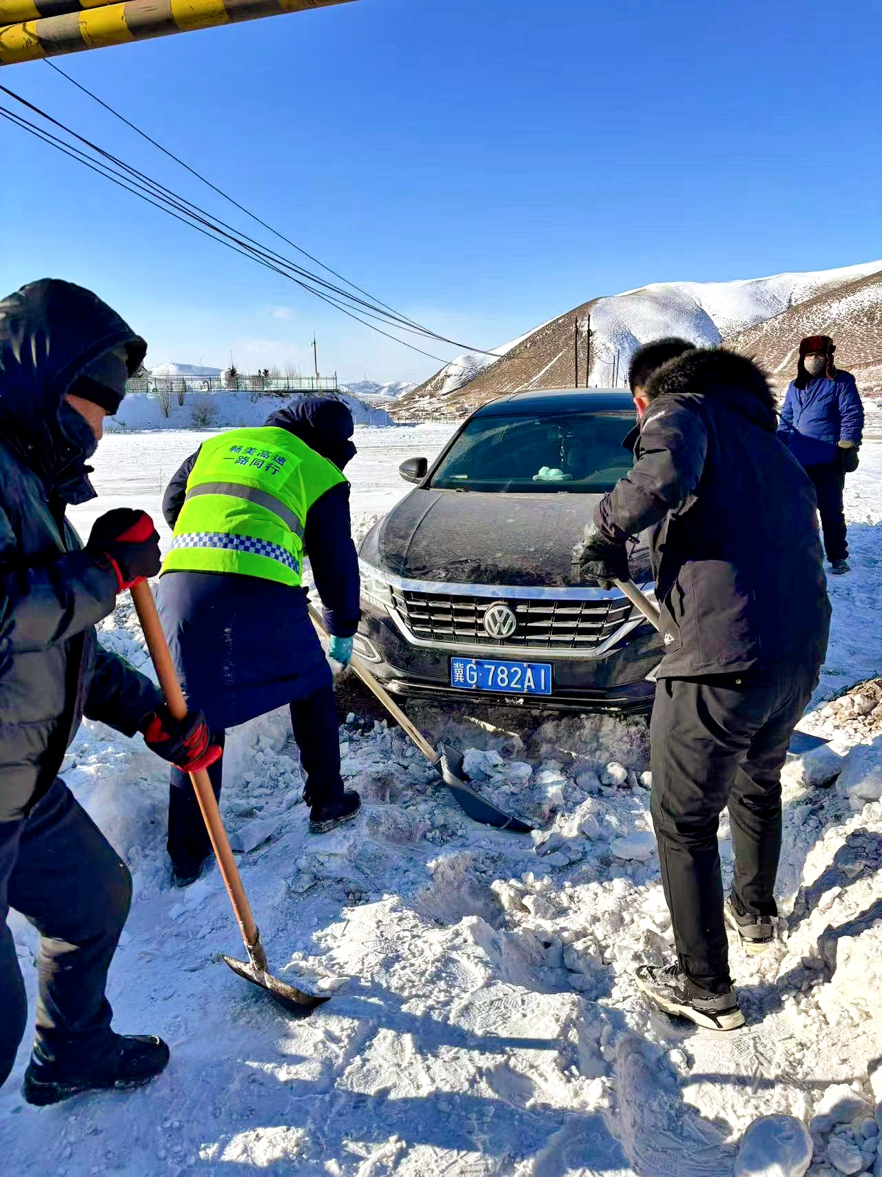 12月26日晌午時分,一輛黑色大眾汽車途經(jīng)張承張家口分公司(延崇分公司)樺皮嶺收費站附近時,因雪天濕滑,車輛不慎陷入路邊雪坑。
