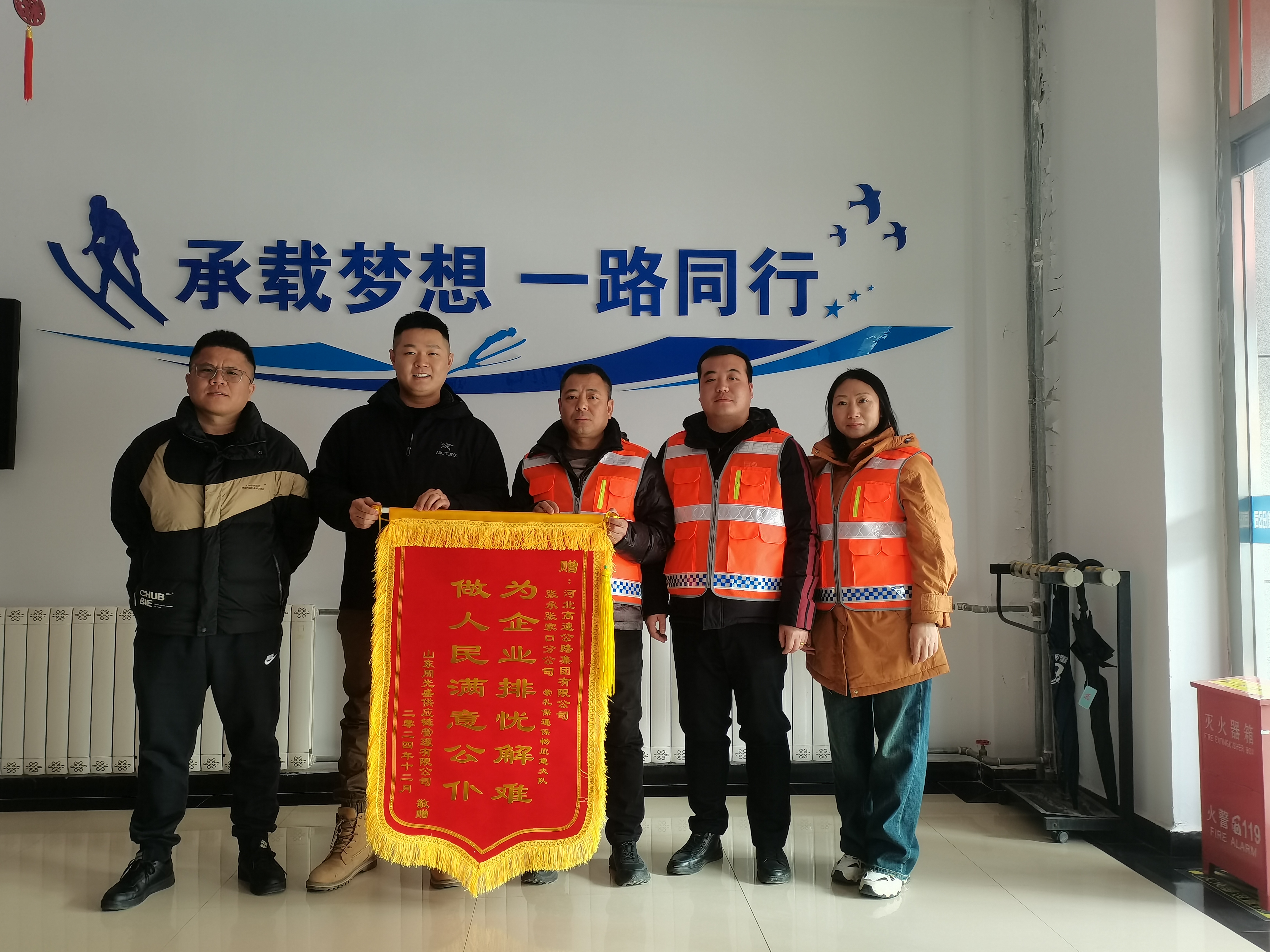 12月30日,山東同光盛供應鏈管理有限公司相關負責人為張承張家口分公司(延崇分公司)崇禮保通保暢大隊送來印著“為企業(yè)排憂解難 做人民滿意公仆”的錦旗,以此感謝崇禮保通保暢大隊為他們順利通行提供優(yōu)質服務。