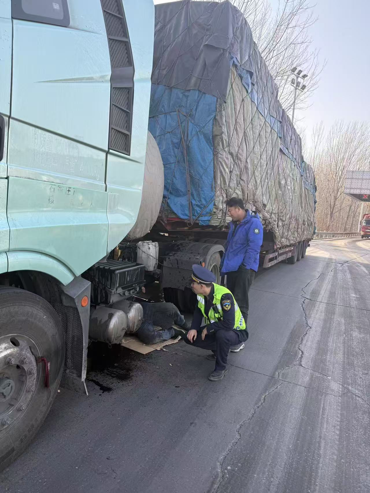 1月13日13時20分左右,一輛貨車駛?cè)敫]嫗收費(fèi)站,細(xì)心的工作人員發(fā)現(xiàn)該車存在液體泄漏情況,并立即通知收費(fèi)班長。班長迅速行動,將該車安全攔停并引導(dǎo)至安全區(qū)域檢查車輛。