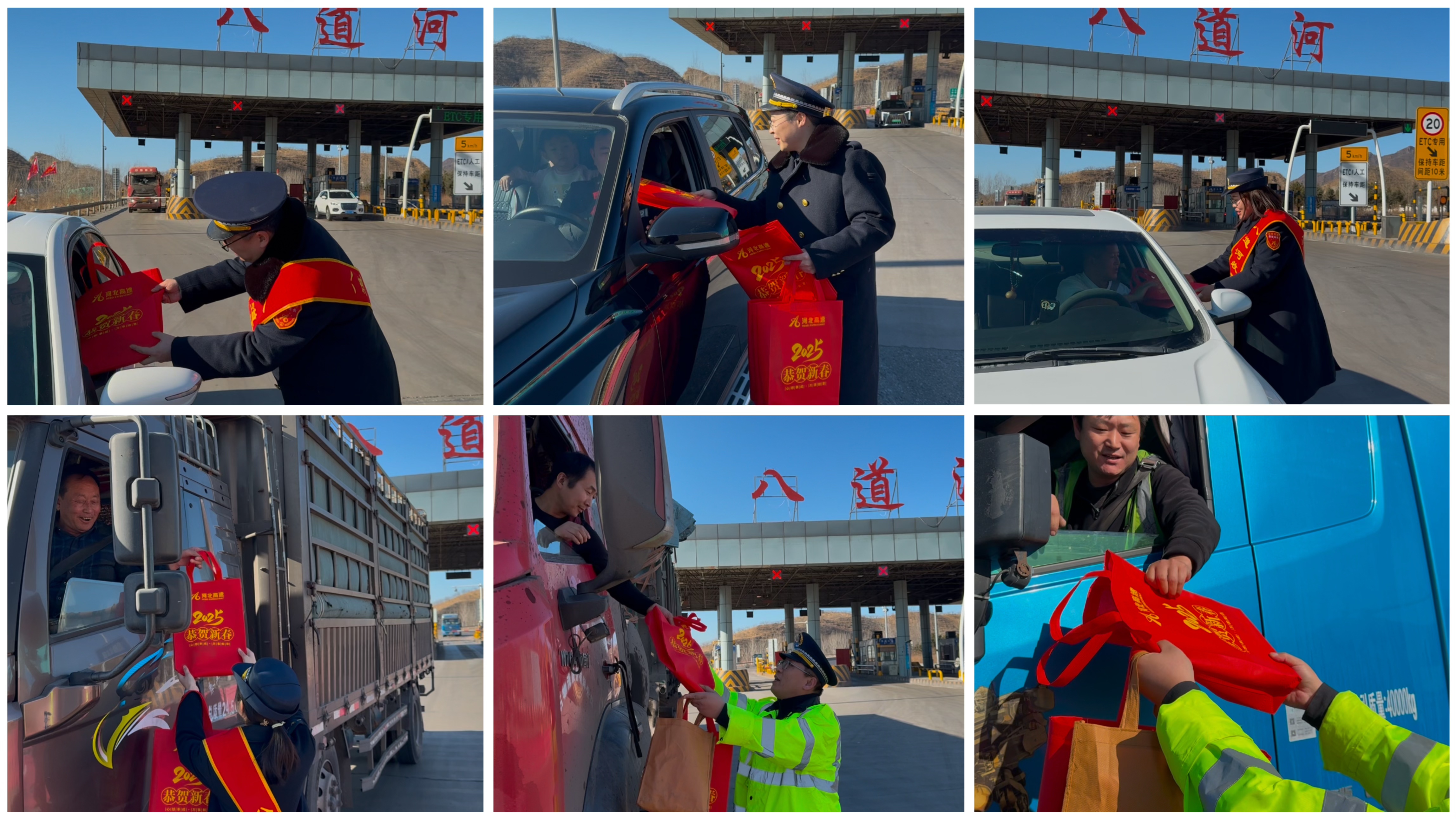 “河北高速祝您新春愉快,闔家歡樂,一路平安。”職工們將大禮包送到過往司乘人員手中,表達對“家人”的新春祝福,一句暖心的祝福,一句真誠的問候,匯聚成濃濃的新春祝福,傳遞著新年的歡樂與喜悅,讓奔波在外的“家人”感受到家的溫暖,體驗八道河收費站的別樣“年味”。