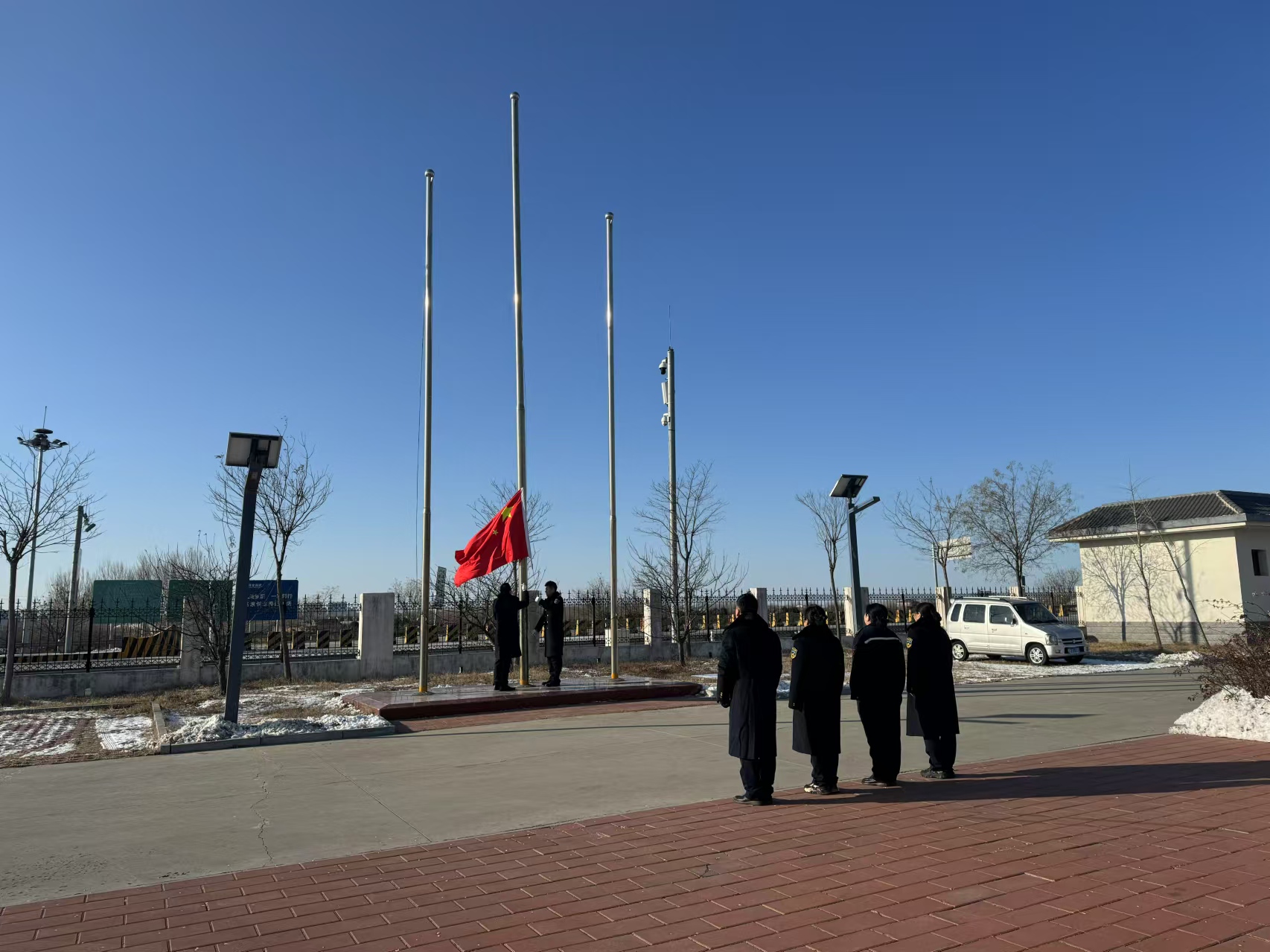 上午8時,所屬各單位在崗職工身著整齊制服,精神抖擻,目光如炬,整齊地排列在升旗臺下。隨著激昂的國歌聲響起,升旗手將國旗用力一揮,五星紅旗緩緩上升,職工們的目光緊緊跟隨著,莊重的神情中滿是對祖國的熱愛與忠誠。