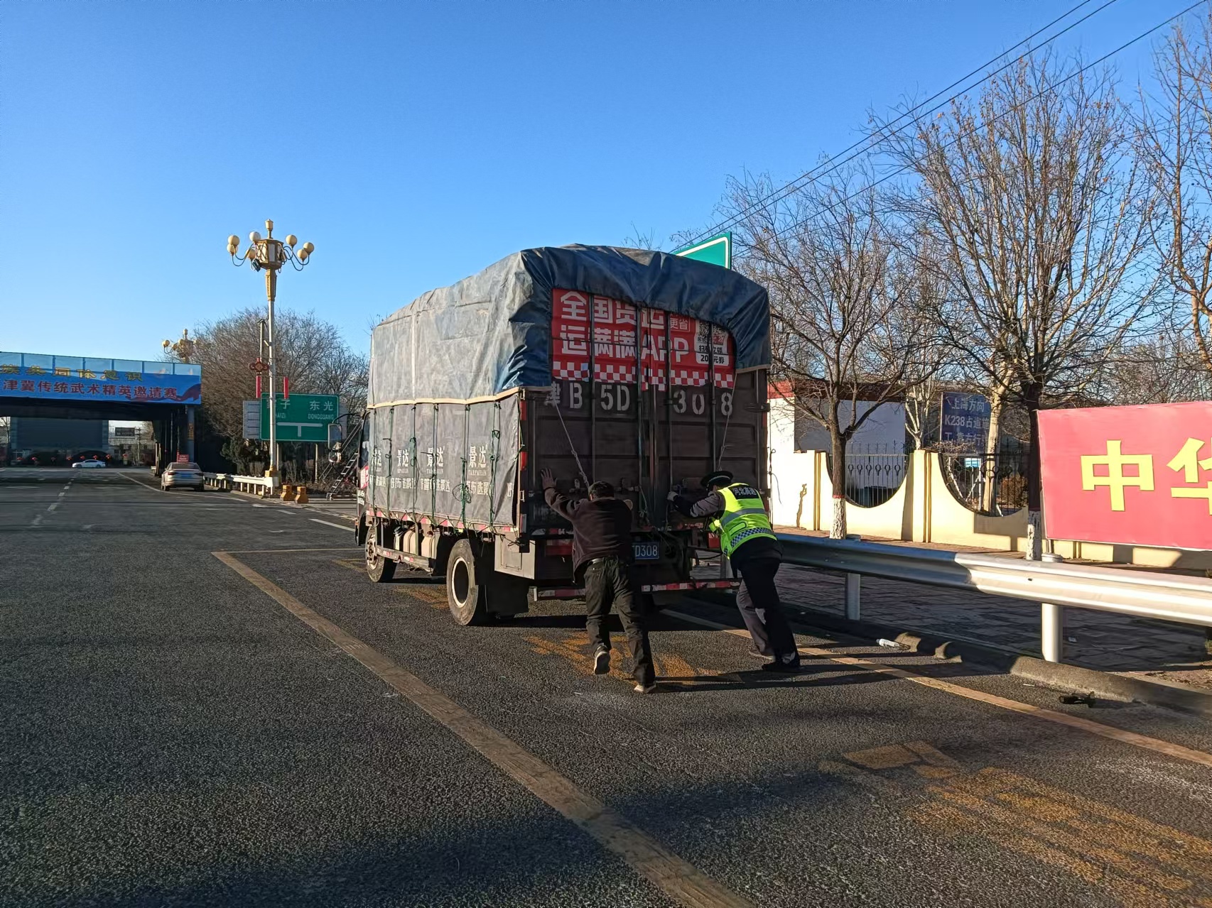仝曉鵬一邊安慰司機別著急,一邊查看車輛狀況。經(jīng)檢查,發(fā)現(xiàn)是機油泄漏導(dǎo)致車輛無法啟動。仝曉鵬與司機家人一起站在車后,雙腳用力蹬地,身體前傾,使出渾身力氣推車。車子一點點移動,在他們的努力下,車輛終于??吭诹送鈴V場安全位置。